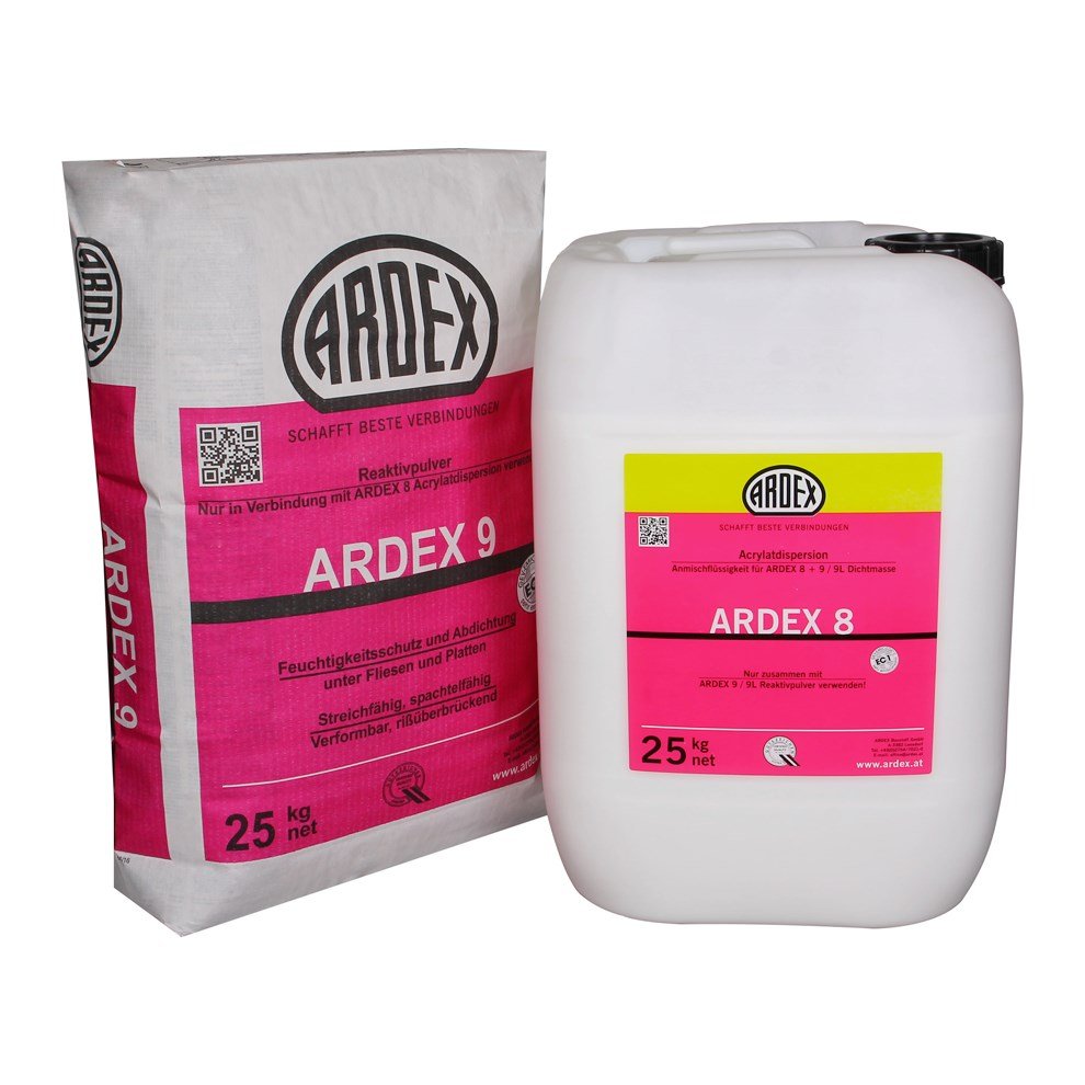 Ardex 8+9 45003+40022 50 kg Çift Bileşenli Elastik Su Yalıtım MalzemesiArdex 8+9 Çift Bilrşrnli Elastik Su Yalıtım Malzemesi. İç ve Dışda Seramik vb Kaplamalar Altında Su Geçirmezlik Sağlayan Yalıtım Malzemesi. Hızlı Uygulama. Hızlı Kuruma. Esnek. Rulo veya Mala ile Uygulama. Solvent İçermez. Değişken Kıvamlarda Uygulanabilir. Üstün Çatlak Köprüleme Özelliği. TS EN 14891 – CM O2P Sınıfına Uygun. Çok Esnek Seramik Karo Yapıştırıcı Olarakda Kullanılabilir. BS 6920-1 Standartlarına Uygun Olarak İçme Suuyu ile temas EdebilirARDEX 8+9 – GENEL BİLGİLERKullanım Alanları. İç ve dış mekanlarda. Duvarda ve zeminde.. Duş banyo genel duş ve banyolar tesisat odaları halka açık ve sanayi bölgelerinde zeminden su gideri olan ıslak mekanlarda her türlü seramik v.b. kaplama malzemesinin altında suyun etki yönünde su yalıtımı amacıyla kullanılır. Sıvanabilir kıvamda aynı zamanda tesviye ve düzeltme işleri yapılabilir.. Binalarda su yalıtım yönetmeliğinde 7. bölümde belirtilen ıslak hacimlerde su yalıtımı ve 8. bölümde belirtilen havuzlar ve su depolarında su yalıtımı için uygundur.Dış Mekanlarda. Balkonlarda ve alt kısmında yaşam mahali bulunmayan teraslarda alt zeminin yalıtılması ve korunması için genellikle çimento şap ve beton zemin üzerine seramik v.b. kaplamalar öncesi uygulanır.Ürün Tipi. ARDEX 8+9 solvent içermeyen litre ağırlığı yaklaşık 1kg olan akrilat dispersiyon ve kuru yoğunluğu 1 2kg/lt olan çimento esaslı toz malzemeden oluşur. Uygulama iki ürünün karıştırılmasıyla yapılır.. Kurumuş ve sertleşmiş ARDEX 8+9 ürünü su geçirmez yüksek elastikiyete sahiptir ve silikon derz dolgularına renk değiştirme etkisi yapmaz.Ambalaj:. 25kg+25kg = 50kgRaf ömrü ve depolama:. Orijinal açılmamış ambalajında güneş ışığı ve dondan korunması şartıyla kuru ve serin ortamda yaklaşık 12 ay depolanabilir. Detaylı bilgi için Whatsapp üzerinden bize ulaşın.