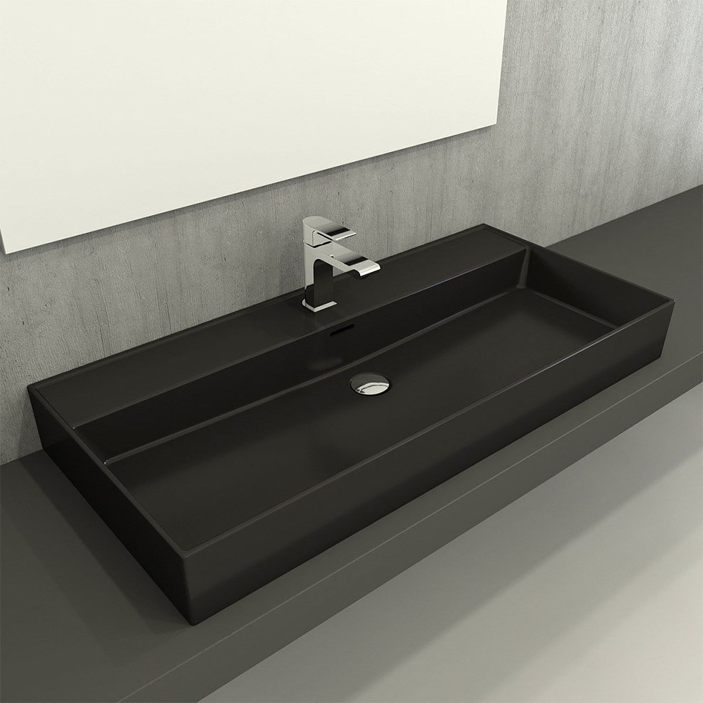 Bocchi Milano 100 cm Mat Siyah Tezgah Üstü Lavabo. Su taşma delikli. Tezgah üstü ve asma kullanıma uygundurÜrün boyutları +- 1 cm değişiklik gösterebilir. Detaylı bilgi için Whatsapp üzerinden bize ulaşın.