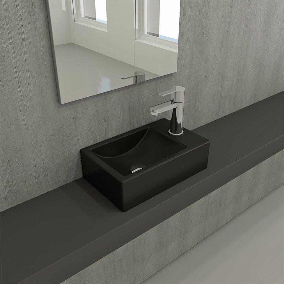 Bocchi Milano 37 cm Mat Siyah Sağ Armatür Delikli Dar Lavabo. Tek armatür delikli su taşma deliksiz. Asma veya tezgah üstü kullanıma uygundur. Altına dolap uygulanabilir.Ürün boyutları +- 1 cm değişiklik gösterebilir. Detaylı bilgi için Whatsapp üzerinden bize ulaşın.