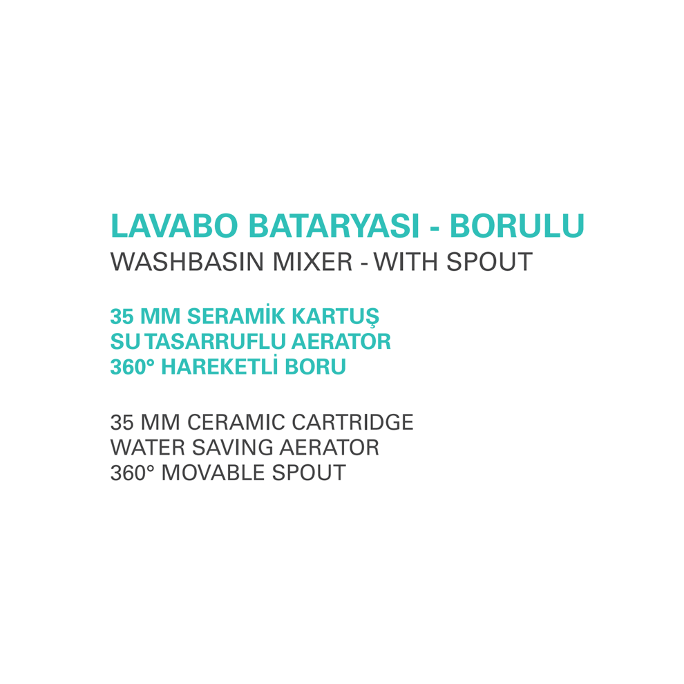 Boden Heidi Lavabo Bataryası Döner Borulu. 35 mm seramik kartuşlu. Su tasarruflu perlatör. 360° hareketli döner boru Detaylı bilgi için Whatsapp üzerinden bize ulaşın.