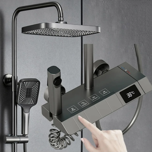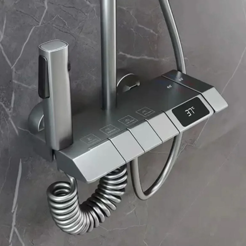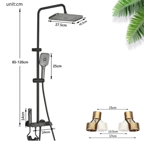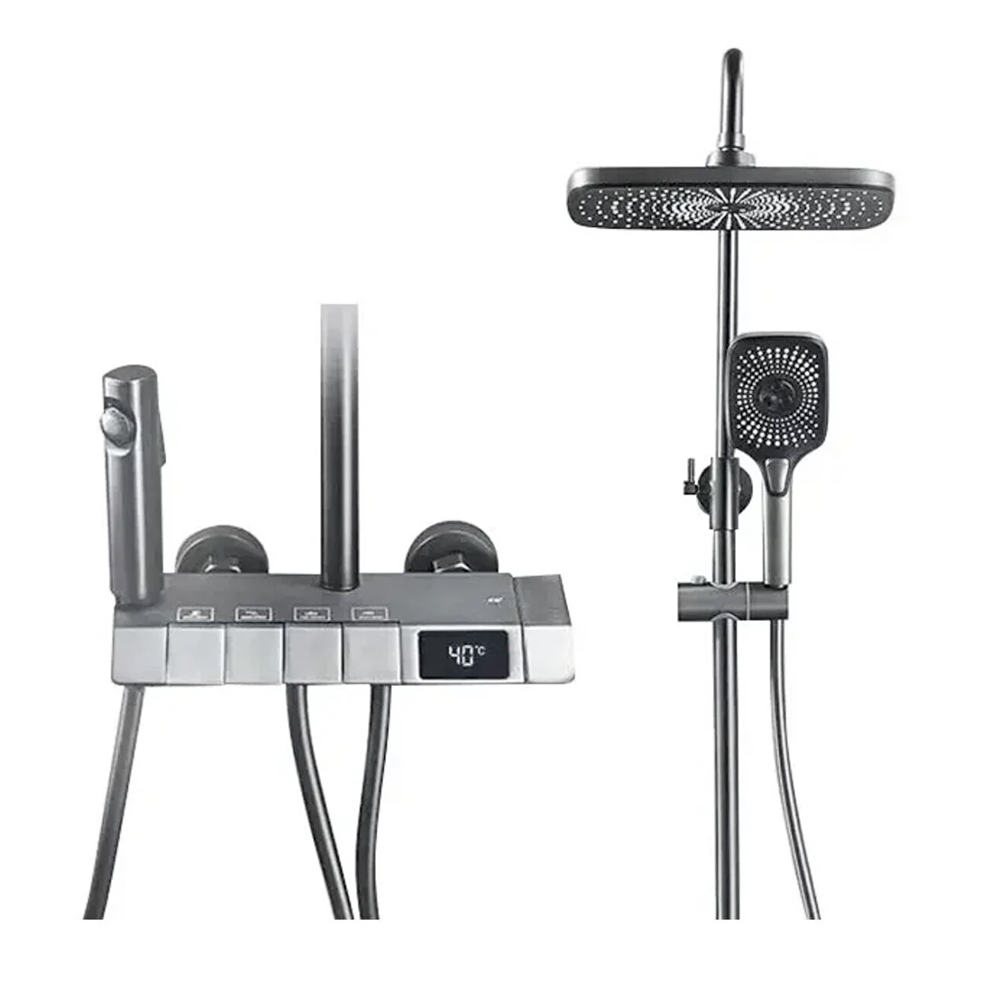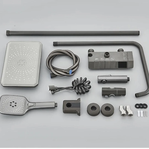 Dijital Termostatik Banyo Bataryalı Kompakt Duş Sistemi. Alttan su çıkışı. Tepe duş başlığı. Shut off sprey el duşu. El duşu 3 fonksiyonlu su akışlı. 4 adet piano tuş dizaynı su yönlendirici. Soyulma ve çizilmeye karşı dayanıklı kaplama. Termostatik banyo bataryası ile sıcaklığı sabit tutun.. Ürünün tüm parçaları antrasit füme renk elektrostatik kaplamalıdır.. Hidroenerji akan su gücü ile pil ve elektrik gerekmeden digital ekranda su sıcaklığını gösteren teknoloji Detaylı bilgi için Whatsapp üzerinden bize ulaşın.