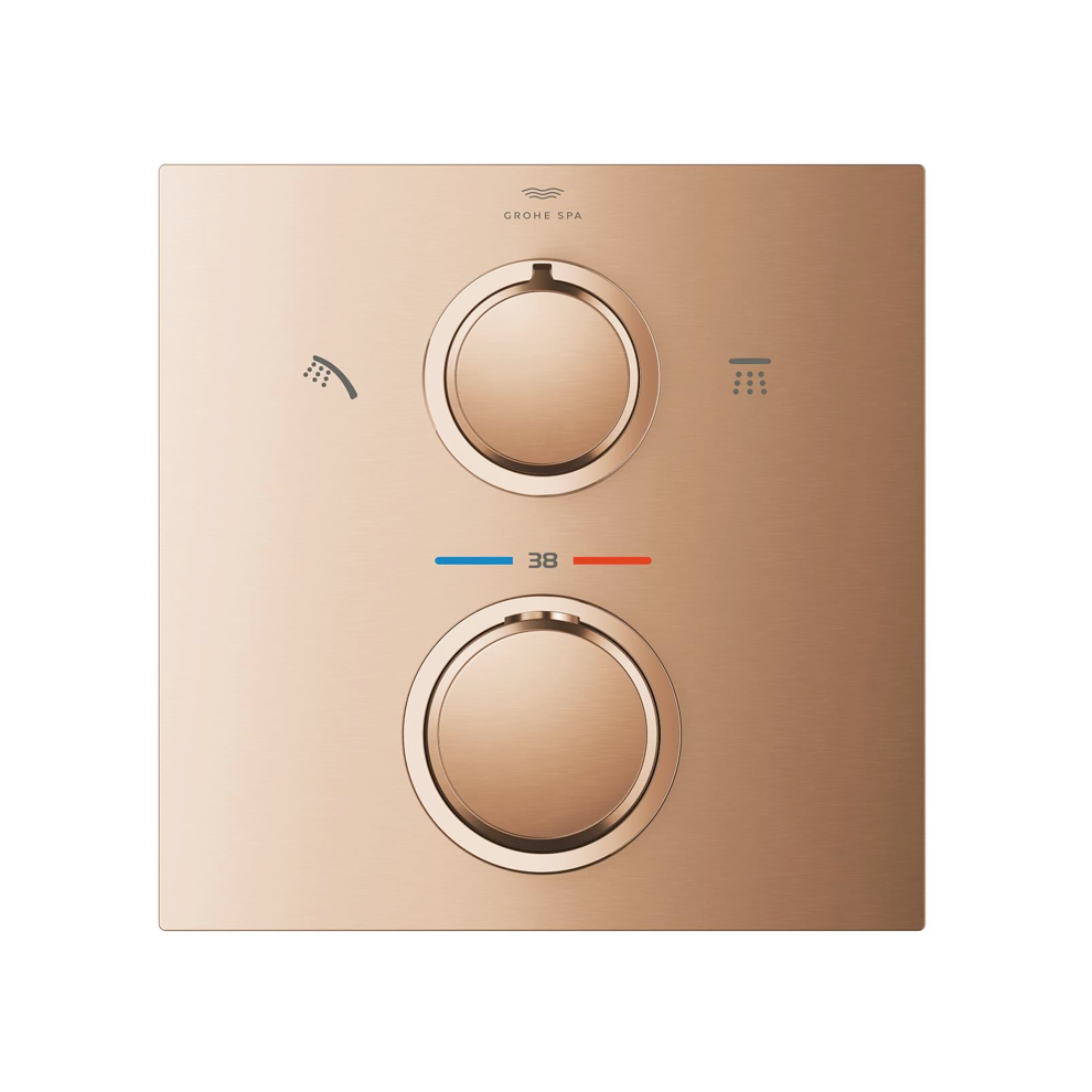Grohe Allure İki Yönlü Ankastre Termostatik Brushed Warm Sunset Banyo ve Duş Bataryası. Montaj için: Rapido Smartbox iç gövde 35604. TurboStat ile sabit sıcaklık. Uzun ömürlü parlak kaplama. FastFixation rozet (gizli montaj ve sabitleme vidaları). Metal rozeti 6° sağa sola ayarlanabilir. Banyo ve duş sembolü. SafeStop 38°C’de sabitlenebilir sıcaklık. SafeStop Plus ilave 43°C veya 46°C’ye kadar sabitleyici ısı ayarı. İki çıkış için yön değiştirici rozet ve sızdırmazlık contası. Metal volan. Akış performansı:çıkış B = 27 l/minçıkış C = 30 l/min. İç gövde hariç. Tepe ve el duşu için yön gösterici ikonİşlevlerin zarif cezbedici formla buluştuğu yeni Grohe Allure koleksiyonu en iyisini isteyenler içindir. İnce ayrıştırıcı profili ve organik geçişleriyle Allure’un estetik yapısı sizi kendine çağırır. Sezgisel kontrol ile muhteşem hassasiyetin buluştuğu bu özel koleksiyonda üstün performans ve yüksek kullanıcı konforu bir arada sunuluyor. Tepe ve el duşu arasında zahmetsizce geçiş yapmanızı sağlamak için tasarlanan ve Almanya’da üretilen bu termostatik duş bataryası dış gövdesi banyonuzu tamamlayan kusursuz bir son dokunuştur. Gömme montaj ile yerden kazandıracak şekilde tasarlanmıştır. Suyu istediğiniz çıkışa zahmetsizce yönlendirirken aynı anda suyun hacmini de ayarlayabilmenizi sağlayan Grohe AquaDimmer ile akışı kolayca kontrol edin. Grohe TurboStat teknolojisi sayesinde rahatsız edici değişimler yaşamadan istediğiniz sıcaklıkta hızlı ve sürekli su akışı elde edebilirsiniz. Çocuklu evler için muhteşem bir tercihtir. Grohe SafeStop devre dışı bırakma düğmesi 38°C olarak ayarlandığı için haşlanma riski ortadan kalkar. Grohe SafeStop Plus opsiyonel sıcaklık sınırlayıcı ise ekstra güvenlik için 43°C veya 46°C’lik bir sınır daha eklemenize olanak tanır. Grohe Fast Fixation kilitleme sistemine sahip rozet ve gizli sızdırmazlık elemanı montajın hızlı ve kolay olmasını sağlar. Çizilmeye karşı ekstra dayanıklı Grohe StarLight PDV kaplama bu banyo bataryası yepyeni görünümünü uzun yıllar boyunca korur. Yeni Grohe Allure: hassasiyetin şekle ve işleve dönüşmüş hali. Bu dış gövde Grohe Rapido SmartBox (35600/35604) ile monte edilmek için tasarlanmıştır. Ayrı satılır. Artık endişelenmenize hiç gerek yok! Bu kombine ankastre montaj çözümü sızıntıya karşı %100 güvenlidir. Detaylı bilgi için Whatsapp üzerinden bize ulaşın.