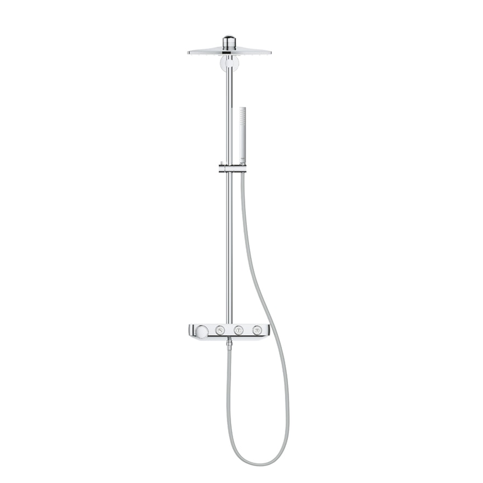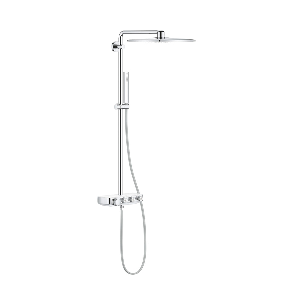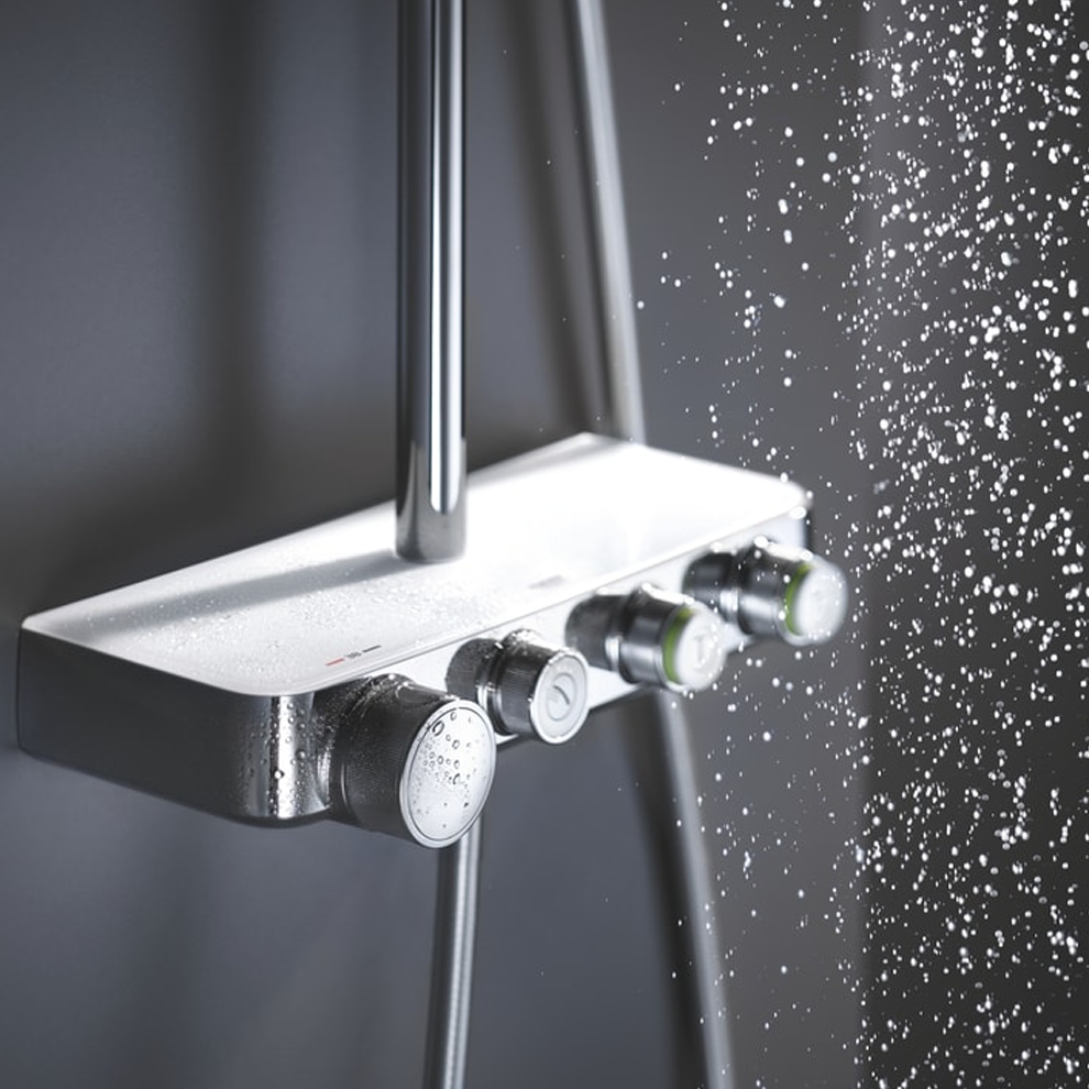 Grohe Euphoria Smartcontrol 310 Cube Duo Termostatik Bataryalı Beyaz Duş Sistemi. Yatay duş kolu 450 mm. Mevcut deliklere minimum adaptasyon için üst braket ayarlanabilir. Sıva üstü SmartControl termostatik batarya. Arasında geçişi sağlar: Rainshower SmartActive 310 Cube tepe duşu ay beyazı sprey plakası. 2 akış şekli: Grohe PureRain ActiveRain. El duşu Euphoria Cube Stick (27698000). Ayarlanabilir yükseklik. Silverflex duş hortumu 1750 mm (28388). DreamSpray mükemmel akış. Uzun ömürlü parlak krom kaplama. CoolTouch el yakmayan yüzey. TurboStat ile sabit sıcaklık. ProGrip kolay tutuş için tırtıklı yüzey. Su tasarrufu ile daha az su tüketimi ve mükemmel akış teknolojisi. 38°C de Grohe SafeStop. SafeStop Plus opsiyonel 43°C sabitelenebilir sıcaklık. Açma-kapama için SmartControl buton Grohe Water Saving su tasarruflu akıştan tam akışa kadar hacim ayarlaması yapmak için kullanılır.. EasyReach duş tablası ile. SpeedClean kireç kırıcı sistem. Uzun ömür için Inner WaterGuide. TwistStop – dolanmayan hortum. Şok ısıtıcılar için uygun 18kW/h. En düşük akış miktarı 7 l/dk.Grohe Euphoria SmartControl 310 Cube Duş sistemi ile her zaman hayalini kurduğunuz lüks sprey desenleri ve konforunuz için tasarlanmış özellikler sunan duşu deneyimleyin. Duşun yenilikçi Grohe SmartControl teknolojisi tepe ve el duşu ile sprey kalıpları arasında geçiş yapmanıza ve bunları birleştirmenize ve bir düğmeyi çevirerek su hacmini ayarlamanıza olanak tanır. Sesi tam akıştan EcoJoy’a çevirerek su tasarrufu yapmak da kolaydır. Kaygan bir küp şekline sahip 310 mm’lik döner tepe duşu iki sprey seçeneğiyle sunulur: Grohe PureRain sprey hafif yağmur gibi yumuşak ve etrafı sarar ve yeni Grohe ActiveRain sprey şampuanı durulamak için yeterince güçlü muhteşem bir şekilde canlandırıcıdır. Euphoria Cube çubuklu el duşu klasik bir Normal sprey ile birlikte gelir. Grohe DreamSpray hangi spreyi seçerseniz seçin her nozülden gelen akışın eşit olmasını sağlar. SpeedClean silikon nozullar basit bir silme işlemiyle kireci temizlemek için tasarlanmıştır. Grohe TurboStat teknolojisi duşunuz boyunca sabit bir su sıcaklığını garanti eder. Grohe SafeStop maksimum 38°C’lik bir sıcaklık belirlemenizi sağlarken SafeStop Plus isteğe bağlı olarak 43°C’lik bir sınır daha sunar. C. Daha fazla güvenlik için Grohe CoolTouch açıktaki termostatın asla dokunulamayacak kadar sıcak olmamasını sağlar. Daha fazla konfor için banyo malzemelerini elinizin altında tutmak için bir EasyReach tepsisi içerir. Dayanıklı ancak göz kamaştırıcı Grohe StarLight krom kaplama tüm setin büyüleyici görünmesini sağlar. Grohe QuickFix kurulumu hızlı ve kolay hale getirir: üst braket mevcut delme deliklerinin yeniden kullanılması için ayarlanabilir. Detaylı bilgi için Whatsapp üzerinden bize ulaşın.
