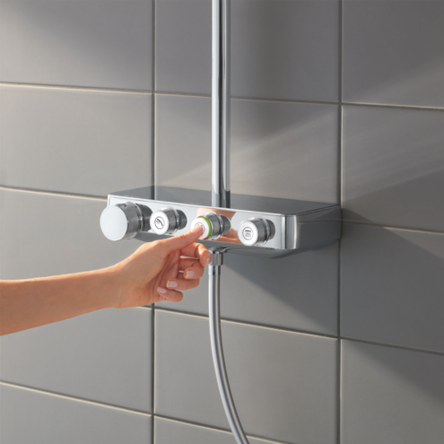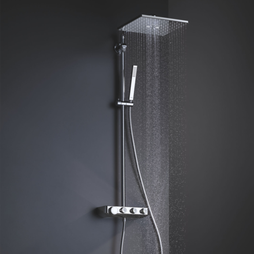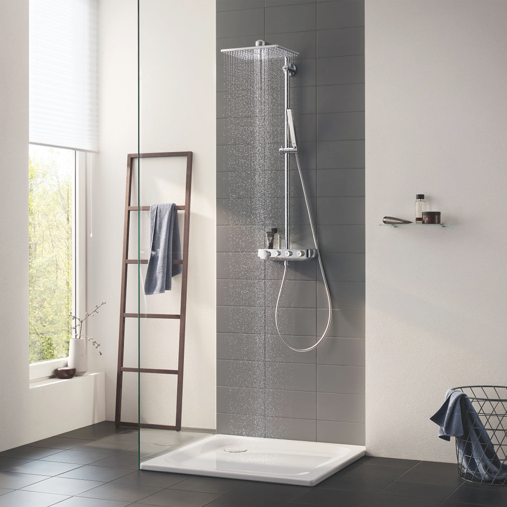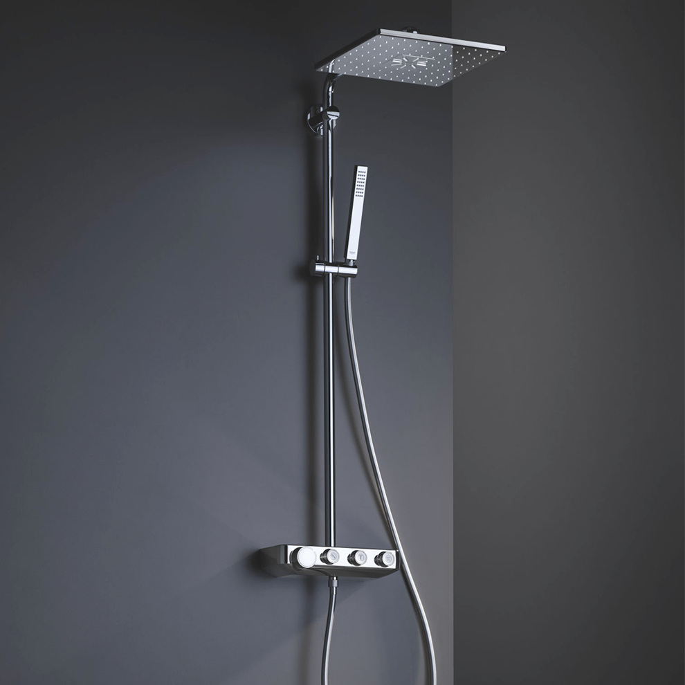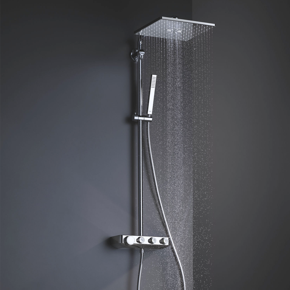 Grohe Euphoria Smartcontrol 310 Cube Duo Termostatik Bataryalı Krom Duş Sistemi. Yatay duş kolu 450 mm. Mevcut deliklere minimum adaptasyon için üst braket ayarlanabilir. Sıva üstü SmartControl termostatik batarya. Rainshower tepe duşu SmartActive 310 Cube. 2 akış şekli: PureRain ActiveRain. Euphoria Cube el duşu (27699000) 9.5 l/dk.. Ayarlanabilir yükseklik. Silverflex duş hortumu 1750 mm (28 388). DreamSpray mükemmel akış. CoolTouch el yakmayan yüzey. TurboStat ile sabit sıcaklık. ProGrip kolay tutuş için tırtıklı yüzey. Su tasarrufu ile daha az su tüketimi ve mükemmel akış teknolojisi. Uzun ömürlü parlak krom kaplama . 38°C de GROHE SafeStop. SafeStop Plus opsiyonel 43°C sabitelenebilir sıcaklık. Açma-kapama için SmartControl buton su tasarruflu akıştan tam akışa kadar hacim ayarlaması yapmak için kullanılır. EasyReach duş tablası ile. SpeedClean kireç kırıcı sistem. Uzun ömür için Inner WaterGuide. TwistStop – dolanmayan hortum. Şok ısıtıcılar için uygun 18kW/h. En düşük akış miktarı 7 l/dk.Duşunuz sizin sığınağınız olmalıdır; bu nedenle Grohe Euphoria SmartControl 310 Küp Duş sistemi yalnızca sprey seçenekleri sunmakla kalmaz aynı zamanda konfor ve güvenlik için sayısız özellik sunar. Ayrıca şık küp şekli gerçek bir tasarım ifadesi oluşturur. Duşun yenilikçi Grohe SmartControl teknolojisi tepe ve el duşu ile sprey kalıpları arasında geçiş yapmanıza ve bunları birleştirmenize ve bir düğmeyi çevirerek su hacmini ayarlamanıza olanak tanır. Sesi tam akıştan EcoJoy’a çevirerek su tasarrufu yapmak da kolaydır. 310 mm Küp döner tepe duşu iki sprey seçeneğiyle sunulur: Grohe PureRain spreyi hafif yağmur gibi yumuşak ve sarmalayıcıdır ve yeni Grohe ActiveRain spreyi muhteşem bir şekilde canlandırıcıdır ve şampuanı durulayacak kadar güçlüdür. Euphoria Cube çubuklu el duşu klasik Normal sprey ile birlikte gelir. Grohe DreamSpray hangi spreyi seçerseniz seçin her nozülden gelen akışın eşit olmasını sağlar. SpeedClean silikon nozullar basit bir silme işlemiyle kireci temizlemek için tasarlanmıştır. Grohe TurboStat teknolojisi duşunuz boyunca sabit bir su sıcaklığını garanti eder. Grohe SafeStop maksimum 38°C’lik bir sıcaklık belirlemenizi sağlarken SafeStop Plus isteğe bağlı olarak 43°C’lik bir sınır daha sunar. C. Daha fazla güvenlik için Grohe CoolTouch açıktaki termostatın asla dokunulamayacak kadar sıcak olmamasını sağlar. Daha fazla konfor için banyo malzemelerini elinizin altında tutmak için bir EasyReach tepsisi içerir. Dayanıklı ancak göz kamaştırıcı Grohe StarLight krom kaplama tüm setin büyüleyici görünmesini sağlar. Grohe QuickFix kurulumu hızlı ve kolay hale getirir: üst braket mevcut delme deliklerinin yeniden kullanılması için ayarlanabilir. Detaylı bilgi için Whatsapp üzerinden bize ulaşın.