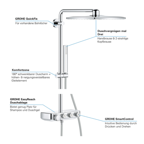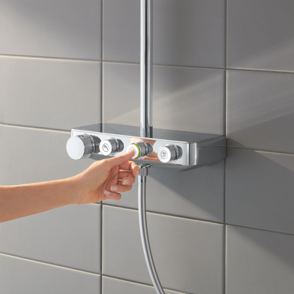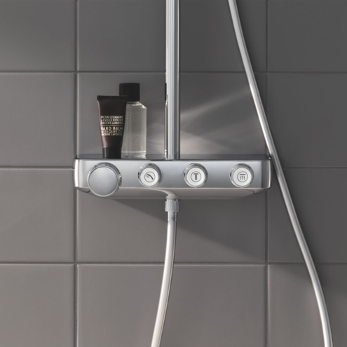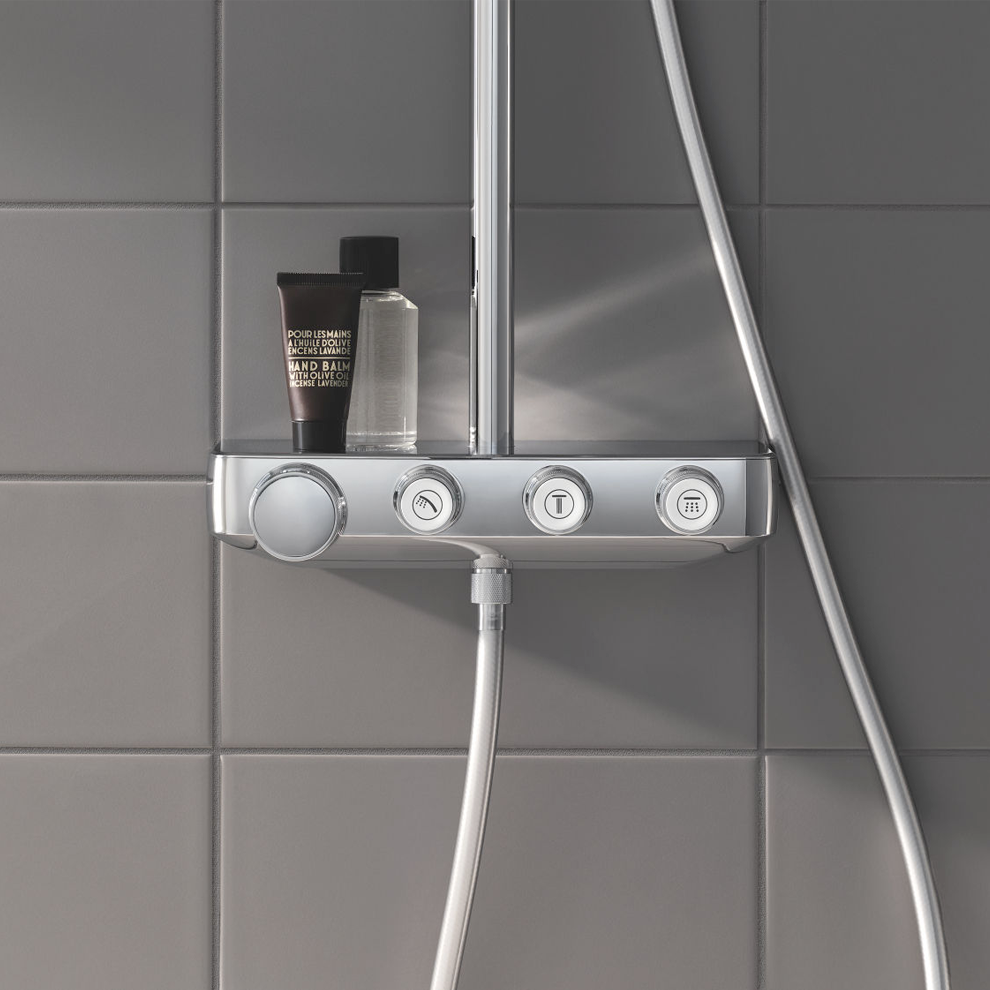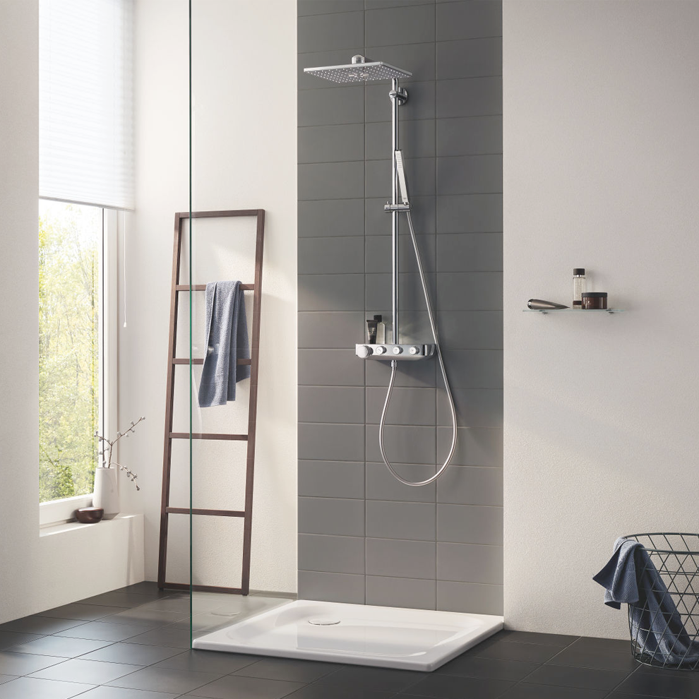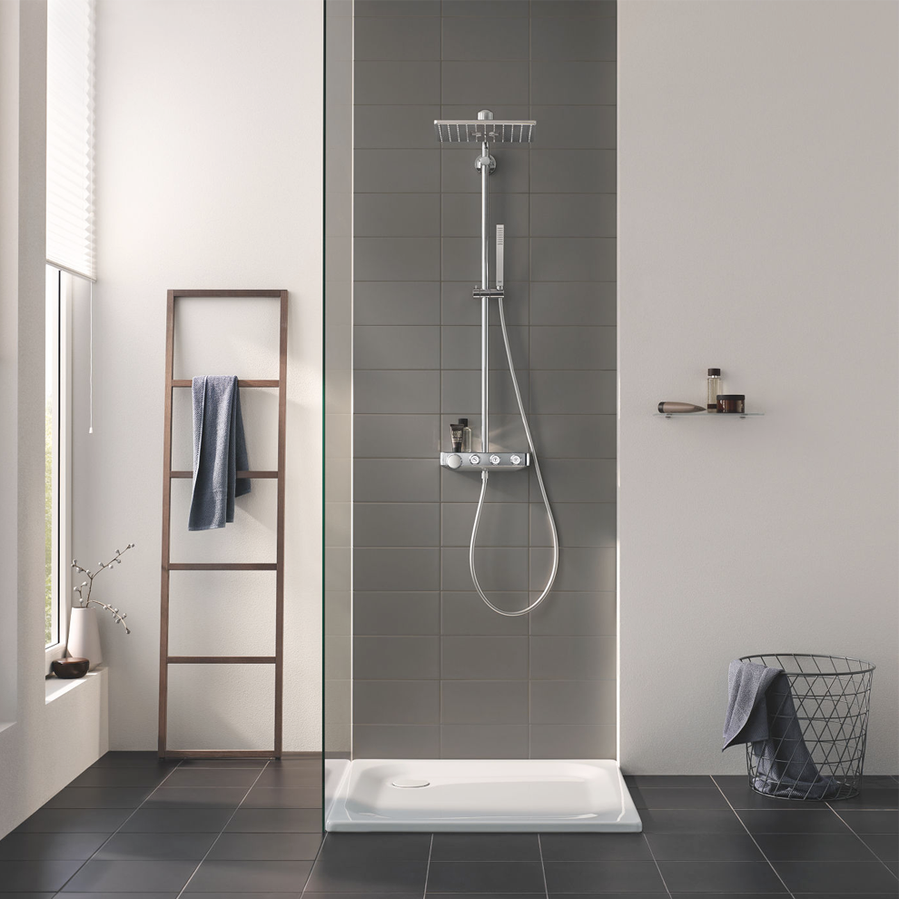 Grohe Euphoria Smartcontrol 310 Cube Duo Termostatik Bataryalı Krom Duş Sistemi. Yatay duş kolu 450 mm. Mevcut deliklere minimum adaptasyon için üst braket ayarlanabilir. Sıva üstü SmartControl termostatik batarya. Rainshower tepe duşu SmartActive 310 Cube. 2 akış şekli: PureRain ActiveRain. Euphoria Cube el duşu (27699000) 9.5 l/dk.. Ayarlanabilir yükseklik. Silverflex duş hortumu 1750 mm (28 388). DreamSpray mükemmel akış. CoolTouch el yakmayan yüzey. TurboStat ile sabit sıcaklık. ProGrip kolay tutuş için tırtıklı yüzey. Su tasarrufu ile daha az su tüketimi ve mükemmel akış teknolojisi. Uzun ömürlü parlak krom kaplama . 38°C de GROHE SafeStop. SafeStop Plus opsiyonel 43°C sabitelenebilir sıcaklık. Açma-kapama için SmartControl buton su tasarruflu akıştan tam akışa kadar hacim ayarlaması yapmak için kullanılır. EasyReach duş tablası ile. SpeedClean kireç kırıcı sistem. Uzun ömür için Inner WaterGuide. TwistStop – dolanmayan hortum. Şok ısıtıcılar için uygun 18kW/h. En düşük akış miktarı 7 l/dk.Duşunuz sizin sığınağınız olmalıdır; bu nedenle Grohe Euphoria SmartControl 310 Küp Duş sistemi yalnızca sprey seçenekleri sunmakla kalmaz aynı zamanda konfor ve güvenlik için sayısız özellik sunar. Ayrıca şık küp şekli gerçek bir tasarım ifadesi oluşturur. Duşun yenilikçi Grohe SmartControl teknolojisi tepe ve el duşu ile sprey kalıpları arasında geçiş yapmanıza ve bunları birleştirmenize ve bir düğmeyi çevirerek su hacmini ayarlamanıza olanak tanır. Sesi tam akıştan EcoJoy’a çevirerek su tasarrufu yapmak da kolaydır. 310 mm Küp döner tepe duşu iki sprey seçeneğiyle sunulur: Grohe PureRain spreyi hafif yağmur gibi yumuşak ve sarmalayıcıdır ve yeni Grohe ActiveRain spreyi muhteşem bir şekilde canlandırıcıdır ve şampuanı durulayacak kadar güçlüdür. Euphoria Cube çubuklu el duşu klasik Normal sprey ile birlikte gelir. Grohe DreamSpray hangi spreyi seçerseniz seçin her nozülden gelen akışın eşit olmasını sağlar. SpeedClean silikon nozullar basit bir silme işlemiyle kireci temizlemek için tasarlanmıştır. Grohe TurboStat teknolojisi duşunuz boyunca sabit bir su sıcaklığını garanti eder. Grohe SafeStop maksimum 38°C’lik bir sıcaklık belirlemenizi sağlarken SafeStop Plus isteğe bağlı olarak 43°C’lik bir sınır daha sunar. C. Daha fazla güvenlik için Grohe CoolTouch açıktaki termostatın asla dokunulamayacak kadar sıcak olmamasını sağlar. Daha fazla konfor için banyo malzemelerini elinizin altında tutmak için bir EasyReach tepsisi içerir. Dayanıklı ancak göz kamaştırıcı Grohe StarLight krom kaplama tüm setin büyüleyici görünmesini sağlar. Grohe QuickFix kurulumu hızlı ve kolay hale getirir: üst braket mevcut delme deliklerinin yeniden kullanılması için ayarlanabilir. Detaylı bilgi için Whatsapp üzerinden bize ulaşın.