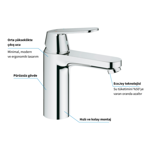 Grohe Eurocosmo M Lavabo Bataryası. Orta yükseklik. Metal kumanda kolu. Grohe SilkMove® 35 mm seramik kartuş. Grohe StarLight® krom kaplama. Ayarlanabilir akış limitleyici. Grohe EcoJoy® perlatör 5.7 l/dk.. Sifon kumandasız. Spiral bağlantı hortumları. Grohe QuickFix® hızlı montaj sistemi. Outlet ibareli ürünler mağazalarımızdaki teşhirde yer alan ürünlerdir. Ürünler satın aldığınız tarihten itibaren minimum 2 yıl garantilidir.. Outlet ürünler kutusuzdur tarafımızdan ambalaj yapılmaktadır.Lavabo ve mutfak bataryaları ile birlikte filtreli ara musluk kullanılması tavsiye edilir.Batarya ve musluk temizliği için çizici sünger aşındırıcı temizleyiciler çözücü ya da asit içerikli temizleyiciler kireç çözücüler sirke ya da asetik asit içerikli temizleyiciler kullanmayınız. Detaylı bilgi için Whatsapp üzerinden bize ulaşın.