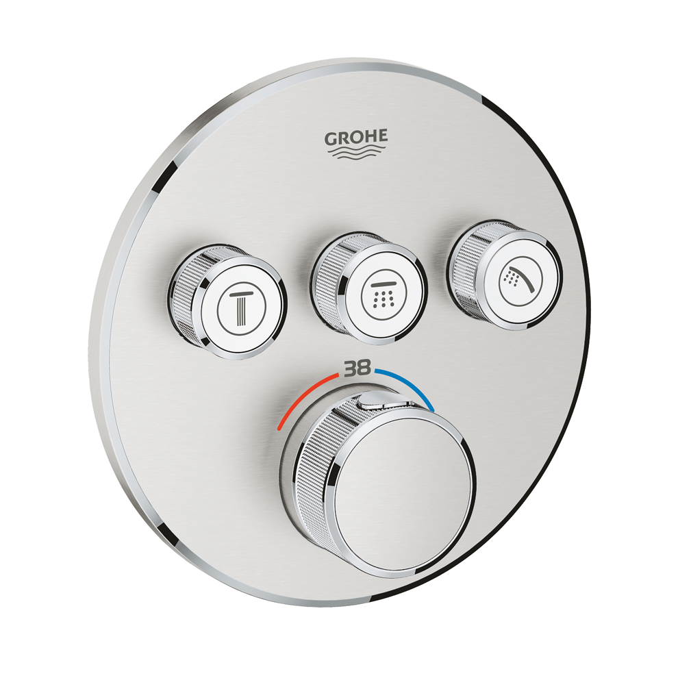 Grohe Grohtherm Smartcontrol Ankastre Termostatik Üç Valfli Paslanmaz Çelik Duş Bataryası. Montaj için: Rapido Smartbox iç gövde 35604. FastFixation özellikli metal duvar rozeti 6° sağa sola ayarlanabilir. Uzun ömürlü parlak kaplama. Açma-kapama için SmartControl buton su tasarruflu akıştan tam akışa kadar hacim ayarlaması yapmak için kullanılır. Değiştirilebilir semboller. TurboStat ile sabit sıcaklık. SafeStop 38°C’de sabitlenebilir sıcaklık. SafeStop Plus ilave 43°C veya 46°C’ye kadar sabitleyici ısı ayarı. Entegre çek valf ve filtre. Aynı anda çoklu çıkış kullanılabilir. İç gövde hariç. Akış performansı: çıkış A = 23 l/min çıkış B = 27 l/min çıkış C = 23 l/minçıkış A + B = 33 l/minçıkış A + B + C = 36 l/minYenilikçi olduğu kadar esnek bir termostatla kontrolü tamamen elinize alın ve şimdiye kadarki en iyi banyo veya duşunuzun keyfini çıkarın. Kullanışlı özelliklerle dolu bu mat SuperSteel Grohtherm SmartControl ankastre termostat her türlü modern banyoyu güzelleştirecek minimalist bir tasarıma sahiptir. Yenilikçi SmartControl teknolojisi istediğiniz püskürtme kaynağını seçmenize ve bir düğmeyi çevirerek su hacmini ayarlamanıza olanak tanır. Üç valf duş kurulumunuz ne olursa olsun tam esneklik sunar – farklı sprey modellerini ve su çıkışlarını kontrol edebilir bunlar arasında geçiş yapabilir ve hatta birleştirebilirsiniz – el tepe ve yan duşların yanı sıra banyo yapmak istediğiniz alanlar için mükemmeldir. Entegre Grohe TurboStat teknolojisi istenmeyen sıcaklık dalgalanmalarını önler. Grohe EasyLogic işaretleri ve değiştirilebilir sembollere sahip dokulu düğmeler kullanımı kolay ve sezgisel hale getirir. Aile dostu Grohe SafeStop geçersiz kılma düğmesi haşlanmayı önlemek için maksimum sıcaklığı 38°C’ye ayarlamanıza olanak tanır. Su tasarrufu sağlayan Grohe EcoJoy teknolojisi size keyiften ödün vermeden azaltılmış akış hızı seçeneği sunar. Grohe QuickFix sistemi sayesinde kurulumu hızlı ve basittir. İnce profili temiz tutmayı kolaylaştırır ve göz kamaştırıcı dayanıklı Grohe StarLight kaplama yıllarca bozulmamış görünür. Minimalist aerodinamik görünüm için mükemmel olan ince yuvarlak bir tasarıma sahip olan bu ürün banyo düzeninizi kesinlikle geliştirecektir. Detaylı bilgi için Whatsapp üzerinden bize ulaşın.