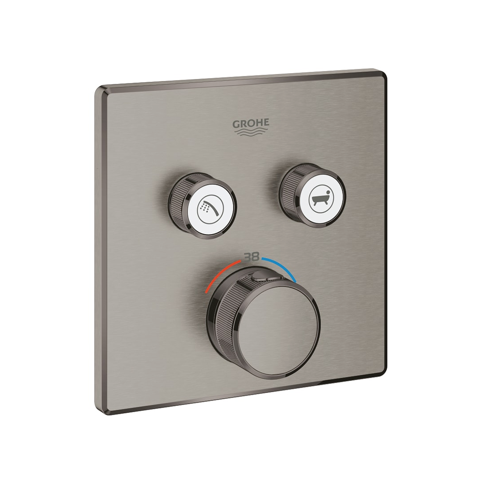 Grohe Grohtherm Smartcontrol Çift Valfli Akış Kontrollü Ankastre Termostatik Brushed Hard Graphite Banyo Bataryası. Rapido Smartbox iç gövde 35 604. FastFixation özellikli metal duvar rozeti 6° sağa sola ayarlanabilir. Açma-kapama için SmartControl buton su tasarruflu akıştan tam akışa kadar hacim ayarlaması yapmak için kullanılır.. Değiştirilebilir semboller. TurboStat ile sabit sıcaklık. SafeStop 38°C’de sabitlenebilir sıcaklık. SafeStop Plus ilave 43°C veya 46°C’ye kadar sabitleyici ısı ayarı. Entegre çek valf ve filtre. Aynı anda çoklu çıkış kullanılabilir. İç gövde hariç. Akış performansı: çıkış B = 24 l/min çıkış C = 26 l/minçıkış B+C = 29 l/minKendinizi suyun akışına bırakmak iyidir ama bazen kontrolü ele almanız gerekir. Grohtherm SmartControl ankastre termostat tam olarak bunu yapmanızı sağlar. Bu termostat; ergonomik tasarımı basılabilen ve döndürülebilen düğme kullanımını ve şık stili kozmopolit banyonuzun merkezine yerleştirir. Yenilikçi SmartControl teknolojisi tek bir düğmeye bastıktan sonra düğmeyi döndürerek istediğiniz sprey kaynağını seçmenizi ve su hacmini ayarlamanızı sağlar. İki valfi sayesinde tepe ve el duşu ya da duş ve banyo arasında kolaylıkla geçiş yapabilir veya bunları birleştirebilirsiniz. Entegre Grohe TurboStat teknolojisi istenmeyen sıcaklık dalgalanmalarını engeller. Grohe EasyLogic işaretleri ve değiştirilebilir simgelere sahip baskılı düğmeleriyle termostatın kullanımı kolay ve sezgiseldir. Aileniz için uygun olan Grohe SafeStop kumanda düğmesi yanmaları önlemek için maksimum sıcaklığı 38°C olarak sabitler. Grohe SafeStop Plus isteğe bağlı sıcaklık sınırlayıcısı daha fazla güvenlik için 43°C’lik bir sınır daha eklemenizi sağlar. Su tasarrufu sağlayan Grohe EcoJoy teknolojisi keyfinizden taviz vermenize gerek kalmadan su akışını azaltma seçeneği sunar. Grohe QuickFix sistemi sayesinde montaj işlemi hızlı ve kolaydır. İnce profil temiz tutmayı kolaylaştırırken çizilmeye karşı ekstra dayanıklılık sağlayan fiziksel buhar biriktirme (PVD) özelliğine sahip güçlü Grohe StarLight kaplama ise kusursuz görünümünü uzun yıllar boyunca korur. Minimalist ve modern bir görünüm için ince ve kare bir tasarıma sahip olan ürün banyo projenizi kesinlikle güzelleştirir. Lütfen bu ürünün Grohe Rapido SmartBox (35600000) ile birlikte kurulması gerektiğini unutmayın. Detaylı bilgi için Whatsapp üzerinden bize ulaşın.