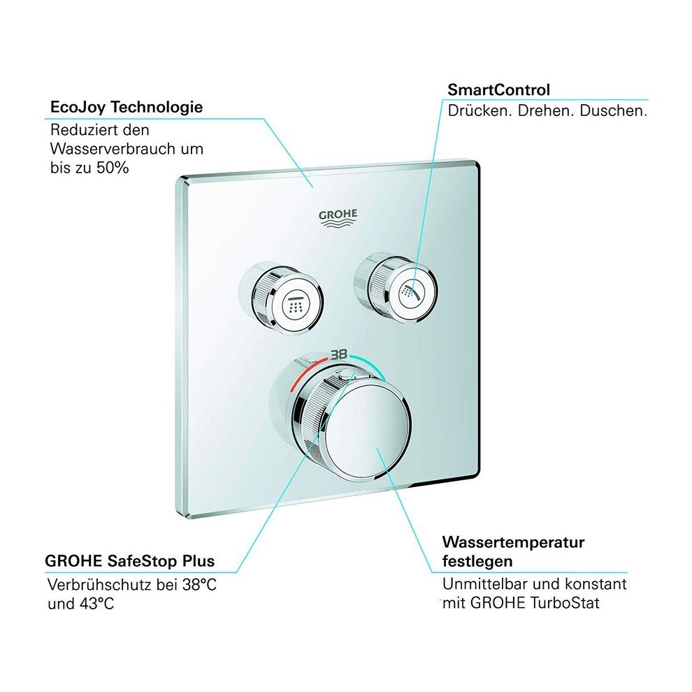 Grohe Grohtherm Smartcontrol Kare Çift Çıkışlı Ankastre Termostatik Banyo Bataryası. Montaj için: Grohe Rapido Smartbox içgövde 35600000. Grohe QuickFix özellikli metal duvar. Rozeti 6° sağa sola ayarlanabilir. Grohe StarLight krom kaplama. Açma-kapama için SmartControl buton EcoJoy su tasarruflu. Akıştan tam akışa kadar hacim ayarlaması yapmak için kullanılır. Değiştirilebilir semboller. Grohe TurboStat ile sabit sıcaklık. Grohe SafeStop 38°C’de sabitlenebilir sıcaklık. Entegre çek valf ve filtre. Aynı anda çoklu çıkış kullanılabilir. İç gövde hariç. Akış performansı:Çıkış B = 24 l/minÇıkış C = 26 l/min Detaylı bilgi için Whatsapp üzerinden bize ulaşın.
