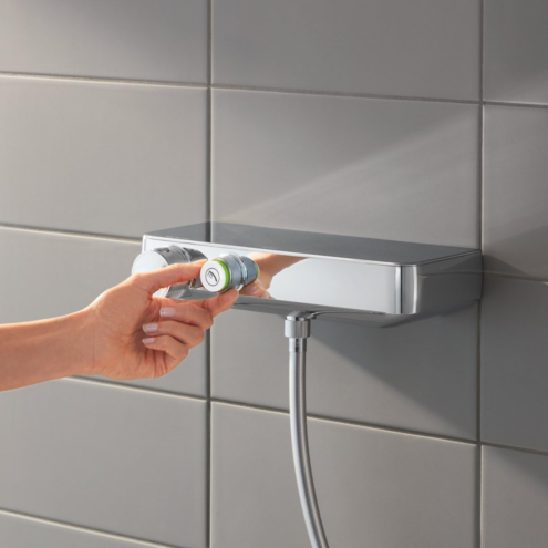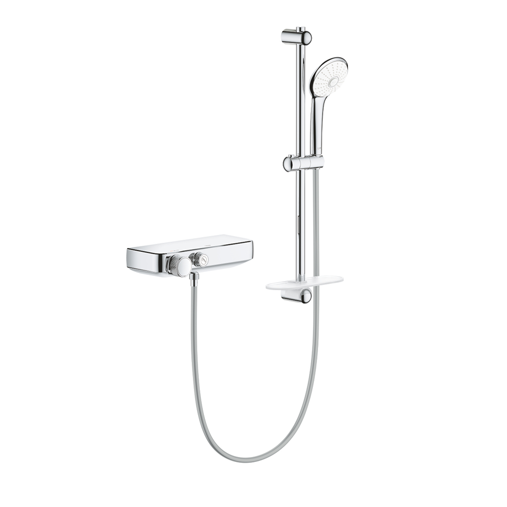 Grohe Grohtherm Smartcontrol Termostatik Krom Duş Bataryası ve Duş Seti. Grohtherm SmartControl termostatik duş bataryası (34719000). Euphoria 110 Massage duş seti 600 mm (27231001)Duvara monte edilmek üzere tasarlanan bu Grohe Grohtherm SmartControl duş setli termostatik duş bataryasının aerodinamik stili duşunuzu kontrol etmeyi kolaylaştırır ve aynı zamanda şık bir tasarım notu verir. Yenilikçi Grohe SmartControl teknolojisi yalnızca bir düğmeye basarak duşu başlatmanıza ve su hacmini ayarlamanıza olanak tanır. Sesi tam akıştan EcoJoy’a çevirerek su tasarrufu yapmak da kolaydır. Termostatik batarya 600 mm duş barı 110 mm el duşu ve 1750 mm bükülmez duş hortumu içeren bir Grohe Euphoria 110 Masajlı duş seti ile birlikte gelir. El duşu 3 sprey seçeneği sunar: Grohe Yağmur Spreyi ve su tasarrufu sağlayan Grohe SmartRain ile canlandırıcı Masaj spreyi. Grohe DreamSpray hangi spreyi seçerseniz seçin her nozülden gelen akışın eşit olmasını sağlar. SpeedClean silikon nozullar basit bir silme işlemiyle kireci temizlemek için tasarlanmıştır. Grohe TurboStat teknolojisi duşunuz boyunca sabit bir su sıcaklığını garanti eder. Grohe SafeStop güvenlik özelliği 38°C’ye ayarlanmıştır ve su sıcaklığını çok yükseltmenizi engeller. İstenirse butona basılarak daha yüksek sıcaklıklar arasında geçiş yapılabilir. Ek güvenlik için isteğe bağlı: Takması kolay Grohe SafeStop Plus sınırlayıcı sıcaklığın 43°C’yi aşmamasını sağlar. Daha fazla güvenlik için Grohe CoolTouch açıktaki termostatın asla dokunulamayacak kadar sıcak olmamasını sağlar. Daha fazla konfor için set banyo malzemelerini elinizin altında tutmak için iki EasyReach tepsisi içerir. Dayanıklı ancak göz kamaştırıcı Grohe StarLight krom kaplama tüm setin büyüleyici görünmesini sağlar. Grohe QuickFix kurulumu hızlı ve kolay hale getirir: Duş rayının üst braketi hareket ettirilerek iki braket arasındaki mesafe mevcut matkap deliklerinin yeniden kullanılması için ayarlanabilir. Grohtherm SmartControl konfor ve tarz içinde sezgisel keyifli bir duşun keyfini çıkarın. Detaylı bilgi için Whatsapp üzerinden bize ulaşın.