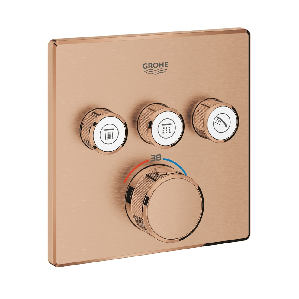 Grohe Grohtherm Smartcontrol Üç Valfli Akış Kontrollü Ankastre Termostatik Brushed Warm Sunset Duş Bataryası. Montaj için: Rapido Smartbox iç gövde 35604. FastFixation özellikli metal duvar rozeti 6° sağa sola ayarlanabilir. Uzun ömürlü parlak kaplama. Açma-kapama için SmartControl buton su tasarruflu akıştan tam akışa kadar hacim ayarlaması yapmak için kullanılır. Değiştirilebilir semboller. TurboStat ile sabit sıcaklık. SafeStop 38°C’de sabitlenebilir sıcaklık. SafeStop Plus ilave 43°C veya 46°C’ye kadar sabitleyici ısı ayarı. Entegre çek valf ve filtre. Aynı anda çoklu çıkış kullanılabilir. İç gövde hariç. Akış performansı: çıkış A = 23 l/min çıkış B = 27 l/min çıkış C = 23 l/minçıkış A + B = 33 l/minçıkış A + B + C = 36 l/minKullanışlılık ve performanstan taviz vermeden modern ve minimalist banyo tasarımını güzelleştirecek bir ürün istiyorsanız her ikisini de bir üst düzeye çıkaracak olan termostatı monte edin. Kullanışlı özellikler taşıyan Grohtherm SmartControl ankastre termostatın yenilikçi SmartControl teknolojisi tek bir düğmeye bastıktan sonra düğmeyi döndürerek istediğiniz sprey kaynağını seçmenizi ve su hacmini ayarlamanızı sağlar. Üç farklı valfi sayesinde tam esneklik sunar. Duş düzeniniz hangi şekilde olursa olsun farklı sprey modellerini ve su çıkışlarını istediğiniz gibi kontrol edebilir aralarında geçiş yapabilir veya birleştirebilirsiniz. Bu özellik banyonun yanı sıra el tepe ve yan duşları kullanmak istediğiniz alanlar için mükemmeldir. Entegre Grohe TurboStat teknolojisi istenmeyen sıcaklık dalgalanmalarını engeller. Grohe EasyLogic işaretleri ve değiştirilebilir simgelere sahip baskılı düğmeleriyle termostatın kullanımı kolay ve sezgiseldir. Aileniz için uygun olan Grohe SafeStop kumanda düğmesi yanmaları önlemek için maksimum sıcaklığı 38°C olarak sabitler. Grohe SafeStop Plus isteğe bağlı sıcaklık sınırlayıcısı daha fazla güvenlik için 43°C’lik bir sınır daha eklemenizi sağlar. Su tasarrufu sağlayan Grohe EcoJoy teknolojisi keyfinizden taviz vermenize gerek kalmadan su akışını azaltma seçeneği sunar. Grohe QuickFix sistemi sayesinde montaj işlemi hızlı ve kolaydır. İnce profil temiz tutmayı kolaylaştırırken çizilmeye karşı ekstra dayanıklılık sağlayan fiziksel buhar biriktirme (PVD) özelliğine sahip güçlü Grohe StarLight kaplama ise kusursuz görünümünü uzun yıllar boyunca korur. Minimalist ve modern bir görünüm için ince ve kare bir tasarıma sahip olan ürün banyo projenizi kesinlikle güzelleştirir. Lütfen bu ürünün Grohe Rapido SmartBox (35600000) ile birlikte kurulması gerektiğini unutmayın. Detaylı bilgi için Whatsapp üzerinden bize ulaşın.
