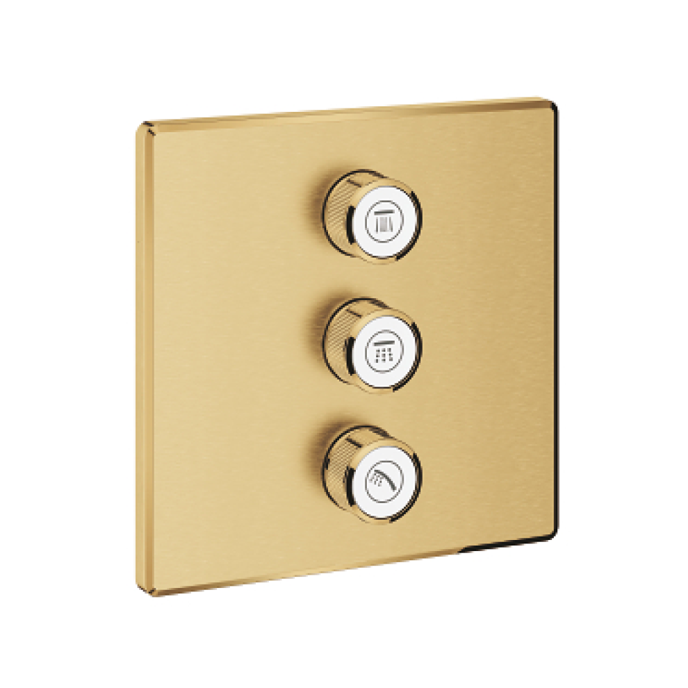 Grohe Grohtherm Smartcontrol Üç Valfli Akış Kontrollü Brushed Cool Sunrise Kumanda. Montaj için: Rapido SmartBox iç gövde 35600 – 35604 – 35601. FastFixation özellikli metal duvar rozeti 6° sağa sola ayarlanabilir. Uzun ömürlü parlak kaplama. Açma-kapama için SmartControl buton su tasarruflu akıştan tam akışa kadar hacim ayarlaması yapmak için kullanılır. Değiştirilebilir semboller. Aynı anda çoklu çıkış kullanılabilir. İç gövde hariç. Akış performansı: çıkış D = 28 l/min çıkış E = 28 l/min çıkış A = 28 l/min çıkış D+E+A = 65 l/minBanyonuzu kendiniz için kullanışlı hale getirin. Grohtherm SmartControl dış gövde; banyo duş el duşu ve yan duşlar arasında geçiş yapmanın yanı sıra su sıcaklığı ve akışını tam olarak istediğiniz şekilde ayarlamanız için sezgisel tek düğme kontrolüne sahiptir. Tek valfli Grohtherm SmartControl termostatla (29123000) birleştirilen bu dış gövde size eksiksiz seçim özgürlüğü sunar. İdeal duşu veya banyo konfigürasyonunuz için dörde kadar su çıkışını kontrol edebilirsiniz. Bu sayede sprey ve su kaynağı seçerken ve kombine ederken daha çok seçeneğe sahip olursunuz. Yenilikçi SmartControl teknolojisi basılabilen ve döndürülebilen tek bir düğmeyle istediğiniz sprey kaynağını seçmenizi ve su hacmini ayarlamanızı sağlar. Grohe EasyLogic işaretleri ve değiştirilebilir simgelere sahip baskılı düğmeleriyle termostatın kullanımı kolay ve sezgiseldir. Grohe QuickFix sistemi sayesinde montaj işlemi hızlı ve kolaydır. İnce profil temiz tutmayı kolaylaştırırken çizilmeye karşı ekstra dayanıklılık sağlayan fiziksel buhar biriktirme (PVD) özelliğine sahip güçlü Grohe StarLight kaplama ise kusursuz görünümünü uzun yıllar boyunca korur. Minimalist ve modern bir görünüm için ince ve kare bir tasarıma sahip olan ürün banyo projenizi kesinlikle güzelleştirir. Lütfen bu ürünün Grohe Rapido SmartBox (35600000) ve Grohtherm SmartControl ankastre kuruluma uygun tek valfli termostat (29123000) ile birlikte kurulması gerektiğini unutmayın. Detaylı bilgi için Whatsapp üzerinden bize ulaşın.