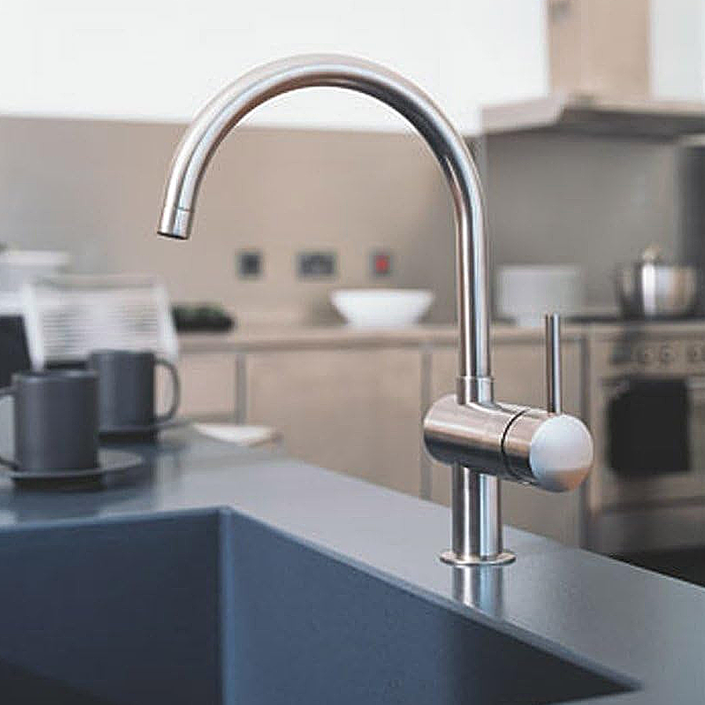 Grohe Minta Paslanmaz Çelik Eviye Bataryası. C tipi çıkış ucu. Uzun ömürlü parlak kaplama. SilkMove 46 mm seramik kartuş. Ayarlanabilir akış limitleyici. Döner çıkış ucu. Ayarlanabilir hareket ekseni 0°/ 150°/ 360°. Spiral bağlantı hortumları. Bağlantı seti 3/8. Hızlı montaj sistemi. Opsiyonel sıcaklık limitleyici ref.no 46308Minta mutfak bataryası havalı modern tasarım ve ileri teknolojinin birleşimidir. Yüksek C şeklinde çıkış ucu ile tasarlanan bu batarya uzun kapları yıkamayı ve doldurmayı bir zevk haline getirir. 0° 150° veya 360° olarak ayarlanabilir dönüş aralığına sahiptir. Bu sayede çıkış ucunu yerinde sabitleyebilir veya iki lavabo arasında kolayca geçiş yapabilirsiniz. Entegre Grohe SilkMove teknolojisi son derece yumuşak bir şekilde hareket eden kumanda kolu sayesinde su sıcaklığının ve hacminin hiç çaba harcamadan hassas bir şekilde kontrol edilmesini sağlar. Grohe SuperSteel kaplaması ile kaplanan batarya mat paslanmaz çelik görünüme sahiptir çizilmeye karşı son derece dayanıklıdır ve sağlamdır. Bu ilgi çekici paketi daha da mükemmel hale getirmek için kolay kurulum sistemimiz sorunsuz bir kurulum sağlar. Yalnızca birkaç adımı takip ederek musluğunuzu çok kısa sürede monte edebilirsiniz. Detaylı bilgi için Whatsapp üzerinden bize ulaşın.”