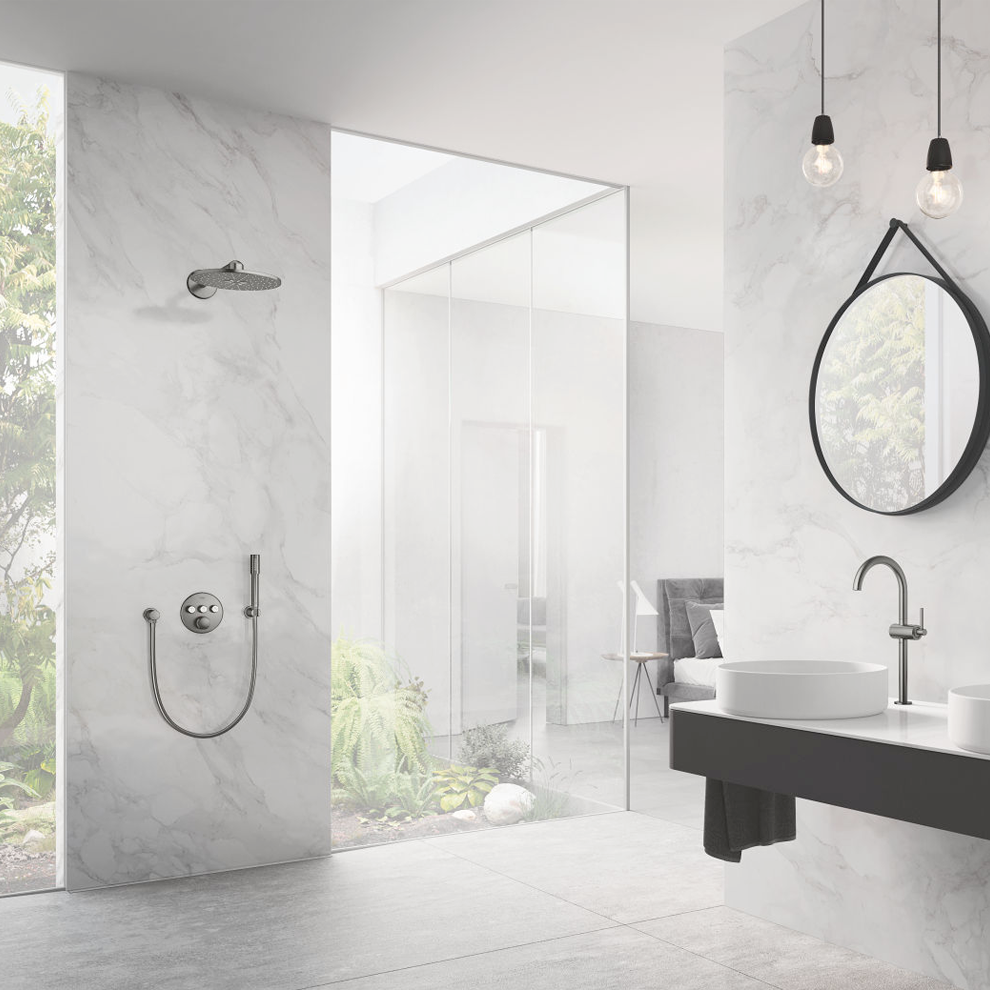 Grohe Rainshower 310 Smartactive 430 mm Brushed Hard Graphite Tepe Duşu. Rainshower tepe duşu SmartActive 310. 2 akış şekli:. PureRain ActiveRain. 430 mm yatay duş kolu. DreamSpray mükemmel akış. Uzun ömürlü parlak kaplama. SpeedClean kireç kırıcı sistem. Uzun ömür için Inner WaterGuide. 26483000 veya 26484000 iç gövdeyle sipariş verilir.Grohe Rainshower 310 SmartActive tepe duşu setinin zarif hatları performans ve kullanışlılık sağlayan duşun tasarımındaki en belirgin özelliklerdir. Duş ikisi arasında geçiş yapabileceğiniz veya her ikisini birden tercih edebileceğiniz iki sprey seçeneği sunar. İlk seçenek sizi yumuşak bir yaz yağmuru gibi saran Grohe PureRain Sprey; ikincisi ise şampuanı durulama gücüne sahip olmanın yanı sıra size uyarıcı bir baş boyun ve sırt masajı yapan yeni Grohe ActiveRain modelidir. Ayrıca satılan Grohtherm SmartControl termostatın basarak ve döndürerek çalıştırılan ergonomik düğmesini veya Grohe SmartControl bataryayı kullanarak bu sprey modellerinden birini tercih edin. 310 mm’lik yuvarlak tepe duşu akışın vücudunuzun tamamını kaplaması ve optimum düzeyde kullanım kolaylığı sağlanması için 400 mm’lik kolun üzerine monte edilir. Grohe DreamSpray teknolojisi duşun tüm nozüllerinden gelen akışı mükemmel bir şekilde ayarlar. SpeedClean teknolojisi tek bir silişte su çıkış noktalarını kireçten arındırmayı sağlar; şık ve uzun ömürlü Grohe StarLight kaplama ise fiziksel buhar biriktirme (PVD) özelliği sayesinde çizilmeye karşı ekstra dayanıklıdır ve kusursuz görünümünü uzun yıllar boyu korur. Güvenlik açısından son derece iyi yalıtılan Inner WaterGuide sıcak suyu yüzeylerden uzakta tutarak yüzeylerin aşırı ısınmasını engeller ve palak krom kaplamanın daha uzun bir süre boyunca kullanılmasını sağlar. Bu ürün Grohe Rainshower Universal iç gövde setini 26484000 (su tasarrufu sağlayan Grohe EcoJoy özellikli) veya 26483000 (Grohe EcoJoy özelliğine sahip olmayan) gerektirir. Bu set ayrıca sipariş edilmelidir. Detaylı bilgi için Whatsapp üzerinden bize ulaşın.