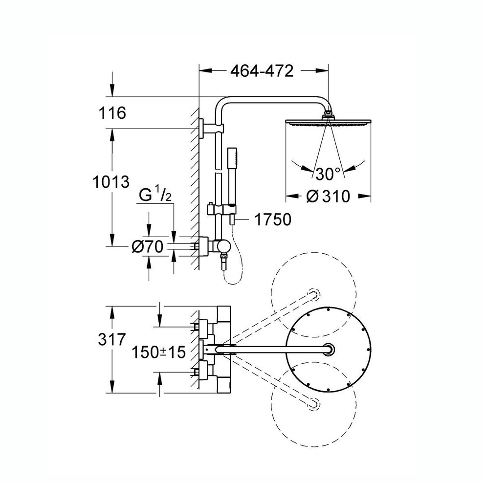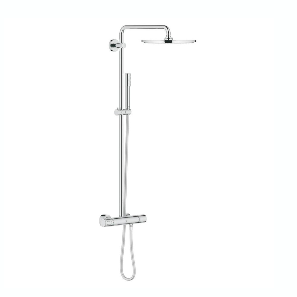 Grohe Rainshower 310 Termostatik Bataryalı Krom Duş Sistemi. Yatay döner duş kolu 450 mm. Aquadimmer özellikli termostatik duş bataryası. Arasında geçişi sağlar: Rainshower Cosmopolitan 310 tepe duşu (27477000). Metal. Mafsallı. ± 15° dönüş açısı. Sena (28034000) el duşu. Ayarlanabilir duş sürgüsü (12140000). Silverflex duş hortumu 1750 mm (28388). TurboStat ile sabit sıcaklık. SafeStop 38°C’de sabitlenebilir sıcaklık. SafeStop Plus opsiyonel 43°C sabitelenebilir sıcaklık. CoolTouch el yakmayan yüzey. DreamSpray mükemmel akış. Uzun ömürlü parlak krom kaplama. SpeedClean kireç kırıcı sistem. Şok ısıtıcılar için uygun 18kW/h. En düşük akış miktarı 7 l/dk.Duş lüksü tasarımcı stiliyle buluşuyor! Geniş 310 mm tepe duşu ve 180° dönebilen duş kolu ile Grohe Rainshower 310 duş sistemi her banyoyu dönüştürür. Cildinizde yumuşak ve yatıştırıcı bir his için tüm nozullardan dengeli bir püskürtme sağlar. Güçlü el duşu ince ve çekici bir tasarıma sahiptir ve duvar rayında kayan bir parçaya sahiptir bu nedenle yüksekliğini ayarlamak çok kolaydır. Grohe CoolTouch teknolojisi sizi ve ailenizi haşlanmaya karşı korumak için termostat yüzeyinin ısınmasını önler. Sistem temizlenmesi kolay ve ışıltısı yıllarca süren çizilmeye karşı dayanıklı Grohe StarLight krom kaplamaya sahiptir. Hem tepe hem de el duşu herhangi bir kireç birikmesini önlemek için esnek silikon nozüllerle üretilmiştir. Detaylı bilgi için Whatsapp üzerinden bize ulaşın.