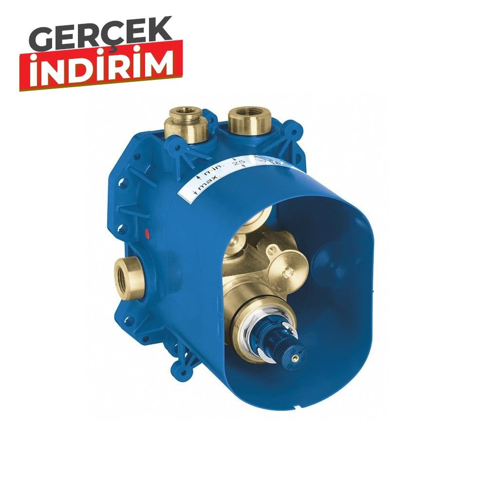 Grohe Rapido T 35500 Ankastre İç Gövde. Universal ankastre termostatik banyo duş bataryaları ve merkezi termostatik kumanda kullanımı için. Dış gövde hariç. Yatay montaj derinliği 70 mm – 95 mm. Montajı kolay hazır montajlı ve test edilmiş ünite. Grohe TurboStat ile sabit sıcaklık. İki üst çıkış 1/2 kilitlenebilir. Üç çıkışın kullanılması durumunda 50 l/dk.’ya kadar yüksek miktar su akışı. 1/2″ alt çıkış – sadece ayrı bir stop valf ile kullanılabilir. Montajı güvenli sabit iç gövde ve korumalı şablon. Tuğla ve alçı duvar için montaj opsiyonlu. Duvar contası. Banyo bataryası için Aquadimmer veya duş bataryası için stop valf. Pirinç gövde. Entegre çek valf ve filtre. Grohe EcoJoy daha az su tüketimi ve mükemmel akış teknolojisiGrohe Rapido T universal ankastre termostatik batarya mükemmel sıcaklık kontrolü garantisi verir. Ankastre kurulum için tasarlanan termostat tüm uygulamalarda kullanılabilir. Entegre duş stop valfi entegre GROHE AquaDimmer banyo veya tepe/el duşu yön değiştiricisi ile birlikte veya bağımsız stop valfler için merkezi termostatik batarya olarak kullanılabilir (stop valf/yön değiştirici ilgili son montaj setine dahildir). Termostatın içinde su basıncının veya sıcaklık dalgalanmalarının anında dengelenmesini sağlayan GROHE TurboStat teknolojisi bulunur. Bu teknoloji güvenilir bir su akışı sağlar ve beklenmedik sıcaklık değişimlerini engeller. Ayrıca entegre GROHE EcoJoy sistemi mükemmel GROHE performansından taviz vermeden su ve enerji tüketimini azaltır. Detaylı bilgi için Whatsapp üzerinden bize ulaşın.”