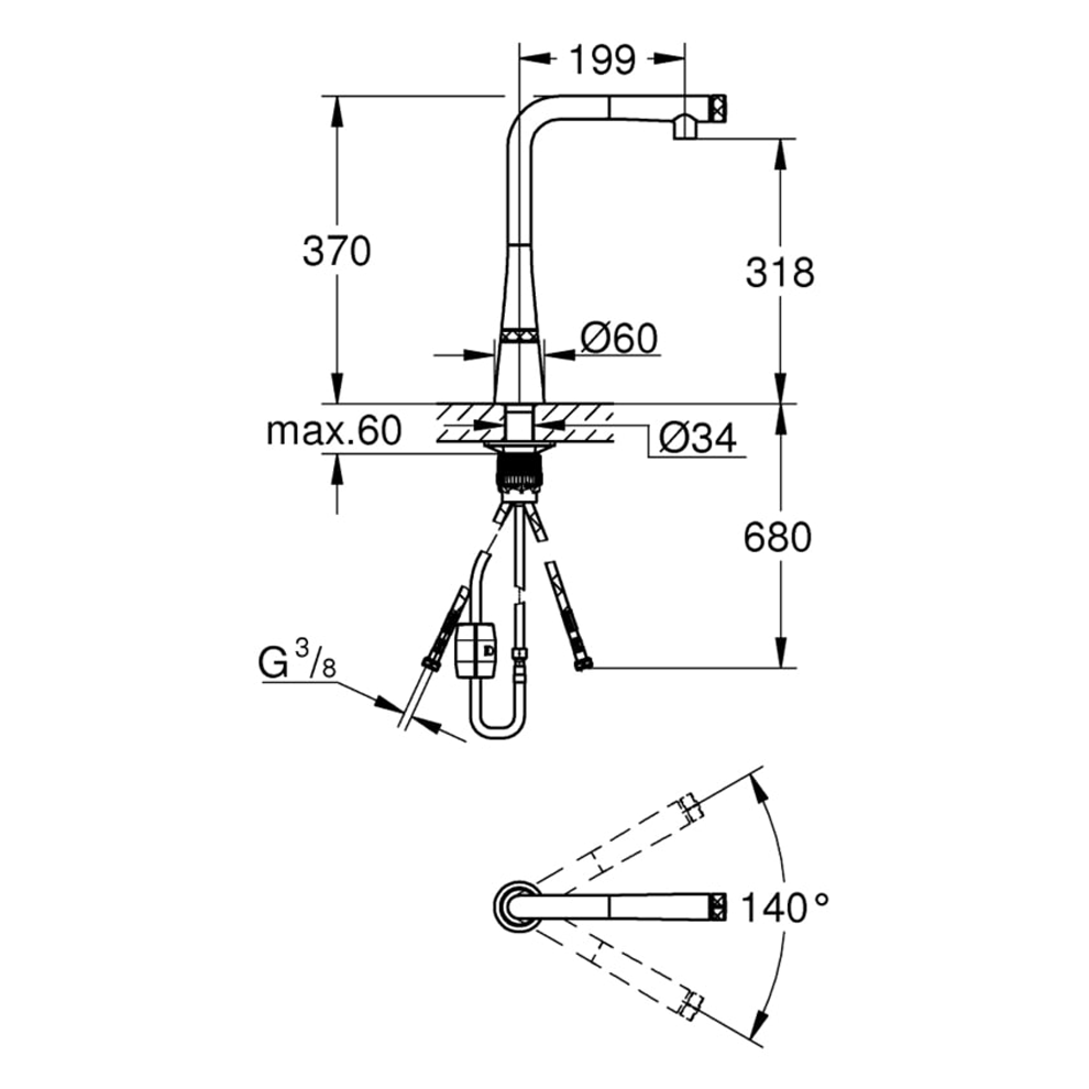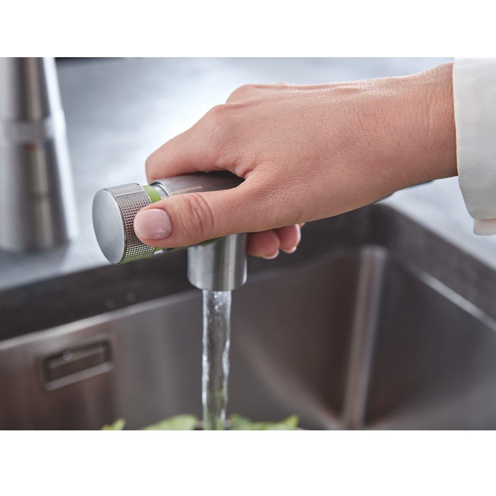 Grohe Zedra Smartcontrol Paslanmaz Çelik Eviye Bataryası. Uzun ömürlü parlak kaplama. Gövde üzerinde sıcaklık ayarı için valf. Döner çıkış ucu. Hareket ekseni 140°. Entegre çek valf. İzole edilmiş iç su yolları kurşun ve nikel içermezHazırlayın temizleyin durulayın: Grohe Zedra SmartControl çok yönlü özellikleri ve basma düğmeli kontrolü sayesinde işinizi kolaylaştırır. Koni şeklindeki şık yapısı tek delikli montaj için tasarlanmıştır. Yenilikçi SmartControl özelliği sayesinde yalnızca bir düğmeye basarak su akışını başlatabilir ve durdurabilirsiniz. Su hacmini su tasarrufu sağlayan ekonomik mod ve tam akış arasında ayarlamak için ise düğmeyi çevirmeniz yeterlidir. Yalnızca dirseğinizle veya bileğinizle dokunarak ellerinizi kullanmadan da suyu açabilirsiniz. Sıcaklık batarya gövdesinde yer alan karıştırma valfiyle kolayca ayarlanır. Batarya L şeklinde yüksek çıkış ucu sayesinde büyük kapları veya vazoları doldurmak için geniş ve rahat bir çalışma alanı sunar. 360° dönebilen çıkış ucu büyük ya da çift hazneli eviyeler için idealdir. Düz akışa sahip spiralli sprey başlığı ilave esneklik sağlayarak su sıçratmadan sebzeleri hazırlamayı ve eviyeyi temizlemeyi kolaylaştırır. Grohe Magnetic Docking özelliği işiniz bittiğinde sprey başlığının takılmadan yerine geri çekilmesini sağlar. Esnek bağlantı hortumlarına sahip Grohe QuickFix Plus hızlı montaj sistemi sayesinde montaj işleminin çabuk ve basit olacağından emin olabilirsiniz. Bu monoblok mutfak bataryası çizilmeye dayanıklı ekstra bir katman için fiziksel buhar biriktirme (PVD) yöntemi kullanan dayanıklı Grohe StarLight kaplamaya sahip olduğu için uzun yıllar boyunca ilk günkü gibi görünmeye devam eder. Detaylı bilgi için Whatsapp üzerinden bize ulaşın.