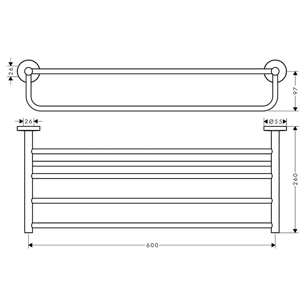 Hansgrohe Logis Universal 60 cm Raflı Havluluk. Askı malzemesi: metal. Malzeme: pirinç. Duvara monte. Uzunluk 600 mm Detaylı bilgi için Whatsapp üzerinden bize ulaşın.