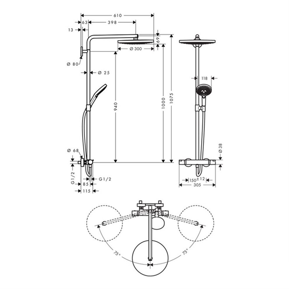 Hansgrohe Raindance Select S 300 2 Jet Duş Kolonu. Raindance Select S 300 2 Jet tepe duşu. Sprey türü: RainAir (hava ile zenginleştirilmiş yağmur spreyi) Rain. Sprey türü ayarı: Select tuşu ile konforlu sprey türü değişimi. RainAir akış miktarı (3 bar basınçta): 15 l/dk. Rain akış miktarı (3 bar basınçta): 15 l/dk. Sprey diski rengi: İki renk sprey diski yüzeyi : krom . Ecostat Comfort termostat. Haşlanmaya karşı koruma: 40°C’de güvenlik kilidi. Ayarlanabilir sıcak su limitleyici. Çıkış yönlendirici: çıkışlar volanlar döndürülerek kontrol edilir. Montaj türü: aplike. Yüksekliği ayarlanabilir el duşu askısıŞunlardan oluşur. Isiflex Duş Hortumu DN15 1 60 m (# 28276000). Raindance Select S 120 3 Jet El Duşu (# 26530000) Detaylı bilgi için Whatsapp üzerinden bize ulaşın.