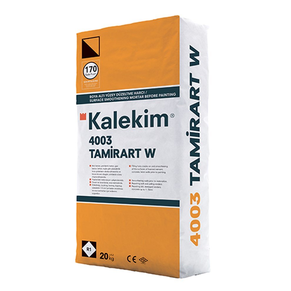 Kalekim 4003 Tamirart W 20 kg Beyaz Tamir HarcıTanım. Boya öncesi düzgün pürüzsüz yüzey oluşturulmasını sağlayan çimento esaslı polimer takviyeli dolgu ve tamir harcıdır.Özellikler. Yüksek yapışma gücüne sahiptir.. Pürüzsüz düzgün ve sağlam yüzey oluşturur.. Beyaz renkte olması sebebiyle kolay boyanabilir.. Donma-çözünme çevrimine dayanıklıdır.. 1-5 mm kalınlığa kadar uygulanabilir.. Kolay uygulanır.Ambalaj. 20 kg kraft.Kullanım Alanı. Brüt beton prefabrik beton gaz beton briket tuğla gibi yüzeylerde ince çatlakların doldurulmasında ve boya öncesi düzgün pürüzsüz yüzey oluşturulmasında.. Yapılardaki restorasyon çalışmalarında.. Duvar ve tavanlarda sıva tamiratında.. Dökülmüş oyulmuş kırılmış kopmuş yüzeylerin 1-5 mm‘ye kadar onarılması ve sıva tamiratları için kullanımı uygundur.Teknik Özellikleri (23°C ve %50 Bağıl Nem)Genel Bilgiler. Görünüm: Beyaz renkli toz. Raf Ömrü: Açılmamış ambalajında kuru ortamda 12 ayUygulama Bilgileri. Uygulama Sıcaklığı: (+5°C) – (+35°C). Karışım Oranı: 6-7 lt su / 20 kg toz veya 1 5-1 75 lt su / 5 kg toz. Kap Ömrü: Min. 60 dak.. Uygulama Kalınlığı: 5 mm (tek katta). Tüketim (Ortalama): 1 26 kg/m² (1mm kalınlık için)Performans Bilgileri. Basma Mukavemeti (EN 12808-3): ≥ 10 0 N/mm² (28 gün). Eğilme Mukavemeti (EN 12808-3): ≥ 2 5 N/mm². Betona Yapışma Mukavemeti (EN 1542): ≥ 0 8 N/mm². Sıcaklık Dayanımı: (-30°C) – (+80°C). Yangına Tepki (EN 13501-1): A1 Detaylı bilgi için Whatsapp üzerinden bize ulaşın.