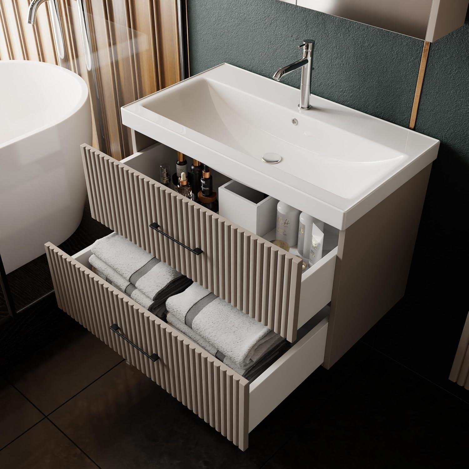 Karen Liana 80 cm Banyo Dolabı. 45 cm tezgah derinliği. Gövde: MDF üzeri termoform kaplama. Kapak: MDF üzeri termoform kaplama. Boy dolabı ayrıca satın alınmalıdır.. Etajerli seramik lavabo dahildir.. Fiyata alt ve üst modül dahildir.. Fiyata armatür ve sifon dahil değildir.. Renk: Alman kahve  Detaylı bilgi için Whatsapp üzerinden bize ulaşın.