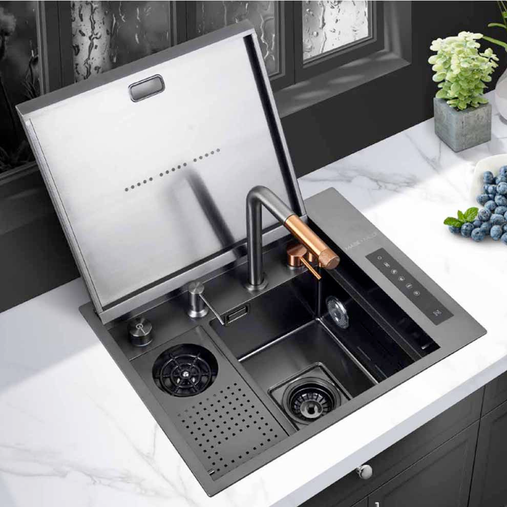 Mase Mode 56 cm Villore Teknolojik Evye Seti. 304 Paslanmaz Çelik. Honeycomb kabartma teknolojisi. Çizilmeye aşınmaya karşı dirençli. Tezgah altı ve üstü montaj için uygundur. . Bataryaya entegre ankastre sıvı sabunluk. Dijital 5 Fonksiyonlu Teknolojik Evye Seti. Arıtma cihazı ile bağlantılı su arıtma musluğu. Döner anahtar ayarlanabilir sıcak ve soğuk su.. Donmuş yiyecekleri üzerinde çözmek için ilave aksesuar. Su gücü ile çalışan sıcaklık ve akış süresini gösteren ekran. Tek tuş ile bastırma gerektirmeyen bardak yıkama fonksiyonu. Temizlenmesi kolay yüksek kaliteli yumuşak silikon su çıkışları. Çift klavuz ray tasarımı: Kaydırma temizleme verimliliğini artırır.. Elektrik bağlantısı gerektirmeyen dijital sıcaklık ve zaman kontrol ekranı. Şelale modu meyve ve sebzeleri temizlemek için kullanışlı ve geniş alan sunar.. Drenaj kontrolörü anahtarı çevirerek eğimli tasarlanmış eviye içindeki suyu temiz ve hızlı bir şekilde boşaltma. Spiralli evye bataryası ile eviyenin her köşesi kolayca temizlenebilir. Evye bataryasındaki iki kanatlı yıkama modu lekeleri kolayca çıkarır.. Product Size: 560*450*230 mm. Cut Out Size: 530*420*R15 mm. Material: SUS304. Eviye kalınlık: 3 mm + 1 2 mmSet İçeriği:. 1 adet süzgeç. Paslanmaz çelik eviye. Bardak yıkama bölümü. Drenaj anahtarı ve eviye seti. Entegre sabunluk ve musluğu. Batarya seti Detaylı bilgi için Whatsapp üzerinden bize ulaşın.