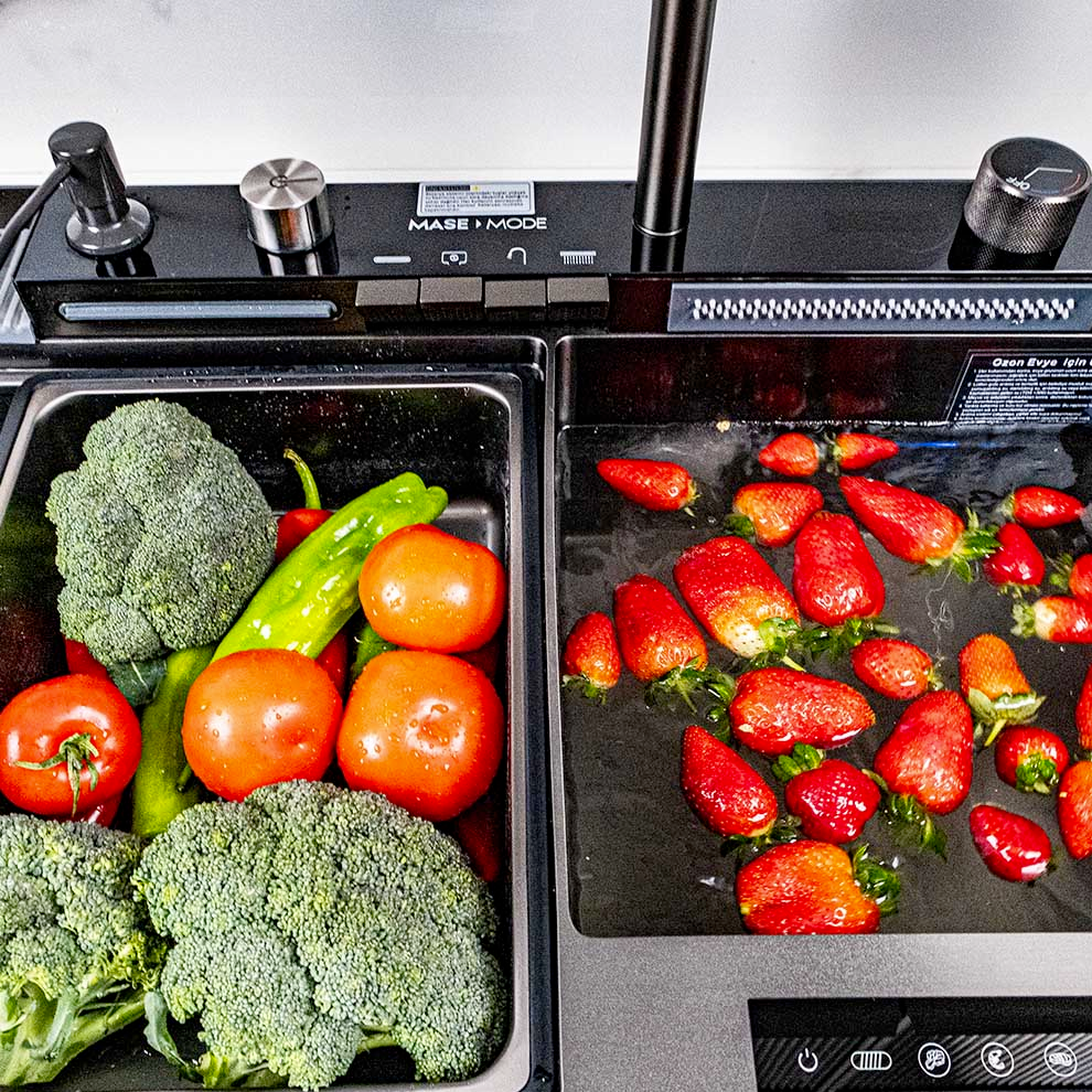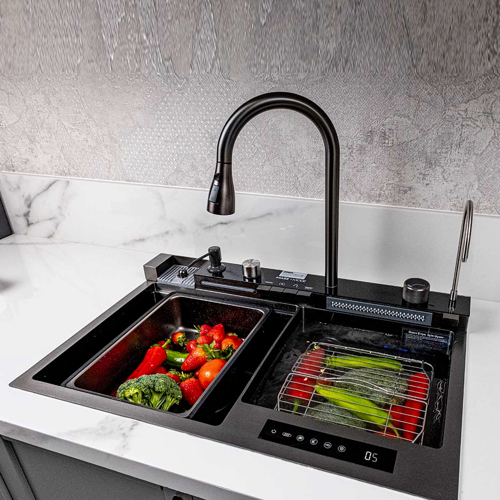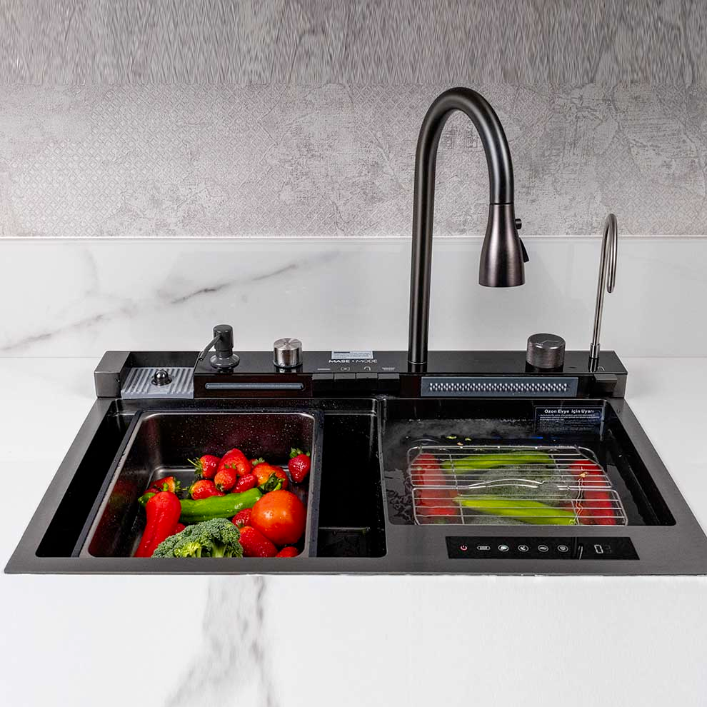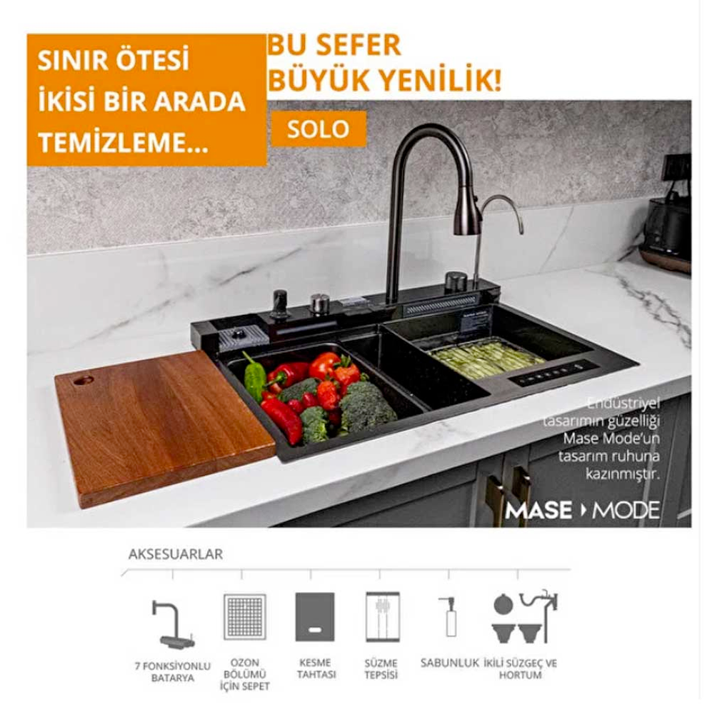 Mase Mode 75 cm Solo Teknolojik Evye Seti. 304 Paslanmaz Çelik. Honeycomb kabartma teknolojisi. Çizilmeye aşınmaya karşı dirençli. Tezgah altı ve üstü montaj için uygundur. . Bataryaya entegre ankastre sıvı sabunluk. Dijital 5 Fonksiyonlu Teknolojik Evye Seti. Arıtma cihazı ile bağlantılı su arıtma musluğu. Döner anahtar ayarlanabilir sıcak ve soğuk su.. Donmuş yiyecekleri üzerinde çözmek için ilave aksesuar. Su gücü ile çalışan sıcaklık ve akış süresini gösteren ekran. Tek tuş ile bastırma gerektirmeyen bardak yıkama fonksiyonu. Temizlenmesi kolay yüksek kaliteli yumuşak silikon su çıkışları. Çift klavuz ray tasarımı: Kaydırma temizleme verimliliğini artırır.. Elektrik bağlantısı gerektirmeyen dijital sıcaklık ve zaman kontrol ekranı. Şelale modu meyve ve sebzeleri temizlemek için kullanışlı ve geniş alan sunar.. Drenaj kontrolörü anahtarı çevirerek eğimli tasarlanmış eviye içindeki suyu temiz ve hızlı bir şekilde boşaltma. Spiralli evye bataryası ile eviyenin her köşesi kolayca temizlenebilir. Evye bataryasındaki iki kanatlı yıkama modu lekeleri kolayca çıkarır.. Boyut: 75x46x23 cm. Eviye kalınlık: 3 mm + 1 2 mmSet İçeriği:. 3 adet süzgeç. Arıtma musluğu. Ahşap Kesme tahtası. İlave el yıkama şelalesi. Paslanmaz Çelik Eviye. Bardak yıkama bölümü. Drenaj anahtarı ve eviye seti. Entegre sabunluk ve musluğu. 7 fonksiyonlu Shark Serisi Batarya Seti Detaylı bilgi için Whatsapp üzerinden bize ulaşın.