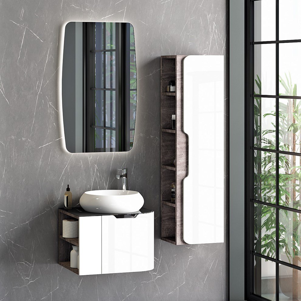Nplus Era 60 cm Banyo Dolabı. Gövde: MDF üzeri melamin kaplama. Kapak: MDF üzeri lake boya. Seramik lavabo dahildir.. 48 cm tezgah derinliği. Ledli ayna modülü. Yavaş kapanır kapak. Fiyata alt ve üst modül dahildir.. Fiyata armatür ve sifon dahil değildir.. Boy dolabı ayrıca satın alınmalıdır.. Renk: Dorado veya berlin. Bu ürün ile birlikte yüksek tip lavabo bataryası kullanılması gerekmektedir. Detaylı bilgi için Whatsapp üzerinden bize ulaşın.