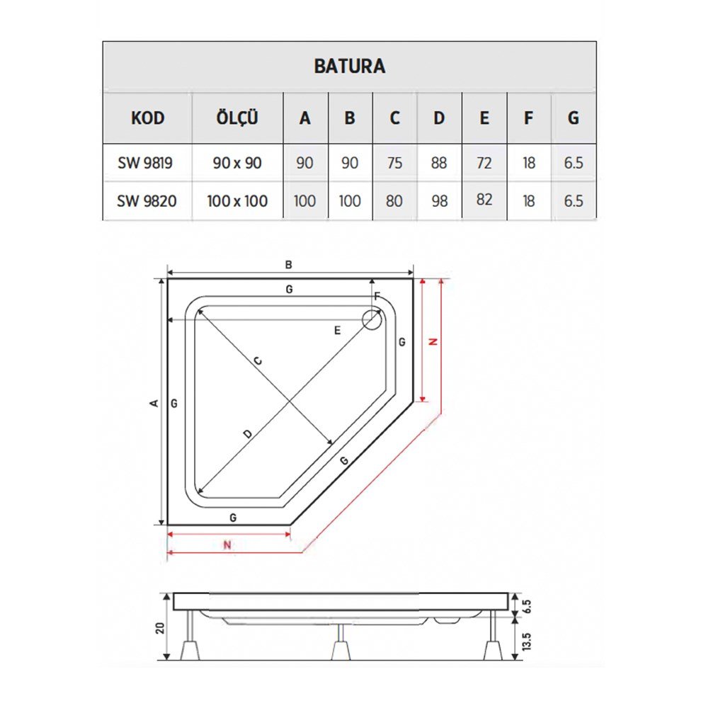 Shower Batura 100×100 cm Beşgen Duş Teknesi. 18 cm yükseklik. Beyaz renk. Ayak panel ve gövde fiyatıdır.Renk seçenekleri kırmızı ve siyahtır.Gövde renkli + panel beyaz ve gövde renkli + panel renkli şeklinde üretilebilmektedir.Duş teknelerinde: gövde renkli + panel beyaz %40 gövde renkli + panel renkli %60 fiyat farkı uygulanmaktadır.Seçim yapmak istediğiniz renk kombinasyonunu sipariş notunda belirtmenizi rica ederiz ! Detaylı bilgi için Whatsapp üzerinden bize ulaşın.