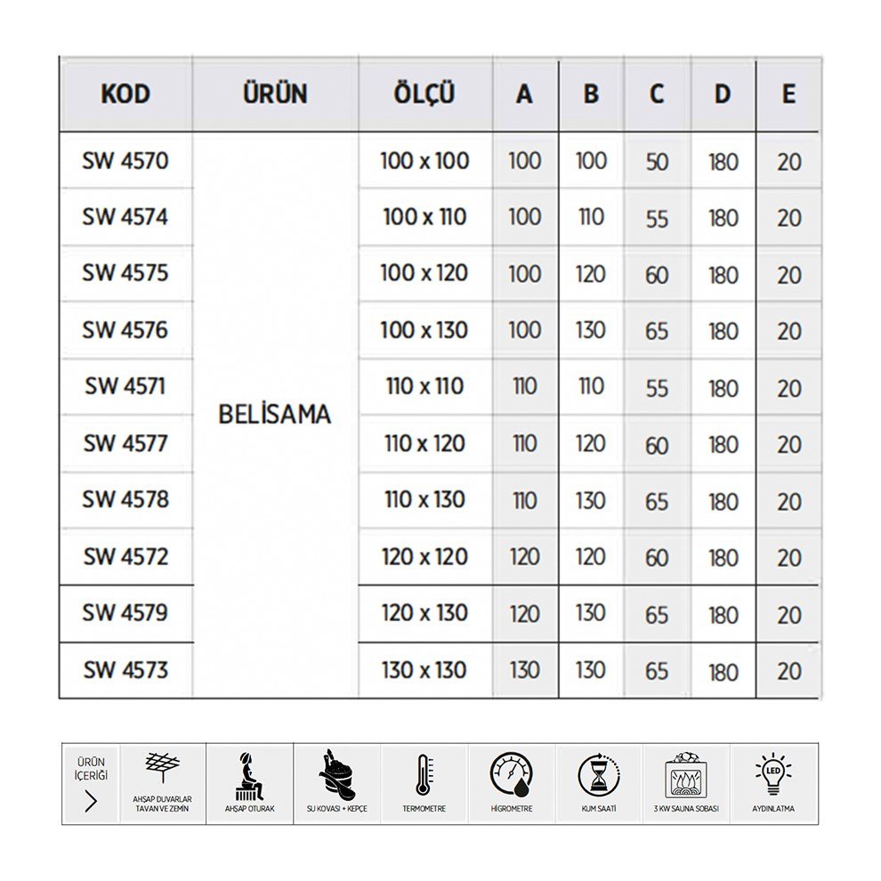 Shower Belisama 130×100 cm Sauna. 215 cm yükseklik. Ahşap duvarlar ahşap tavan ve zemin. Ahşap oturak. Su kovası ve kepçe. Termometre. Higrometre. Kum saati. 3 kw sauna sobası. Led aydınlatmaBu ürün sağ konumlandırmaya uygundur. Detaylı bilgi için Whatsapp üzerinden bize ulaşın.
