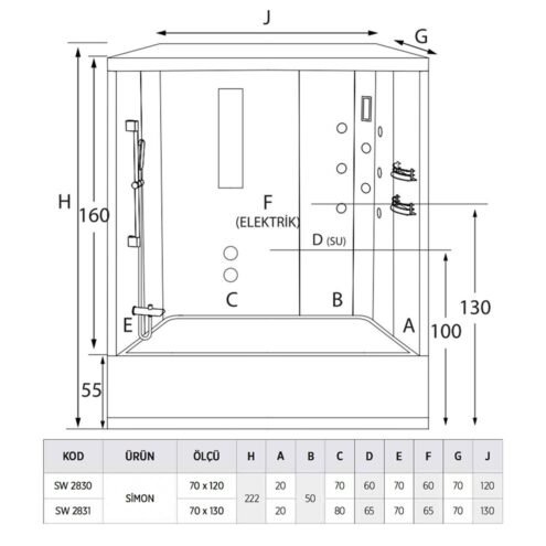 Shower Simon 120×70 cm Dikdörtgen Küvet Üzeri İki Duvar Arası Kompakt Sistem. 222 cm yükseklik. Hidro sistem. Buhar sistemi. Krom renkTekne ve tavan beyaz %10 full siyah modellerde %20 fiyat farkı uygulanmaktadır.Renk seçenekleri kabinler için geçerlidir iç duvar standart çerceve profil rengi parlaktır.Yapacağınız renk seçeneği için 444 47 31 numaralı destek hattımızdan bilgi alabilirsiniz.Sistem 1:. Akrilik dikdörtgen küvet duvar ve tavan. 6 mm lüks kabin. Sürgülü el duşu. Yönlendiricili batarya. Yönlendiricili gaga. 10’lu jet sistemi. Tepe duşu. Şampuanlık ve aynaSistem 2:Sistem 1’e ek olarak;. Lamba. FanSistem 3:Sistem 1’e ek olarak;. Lamba. Fan. Radyolu dijital kontrol paneli. Ozon engelleyiciSistem 4:Sistem 1’e ek olarak;. Lamba. Fan. Radyolu dijital kontrol paneli. Ozon engelleyici. Buhar sistemi. Bluetooth telefon Detaylı bilgi için Whatsapp üzerinden bize ulaşın.