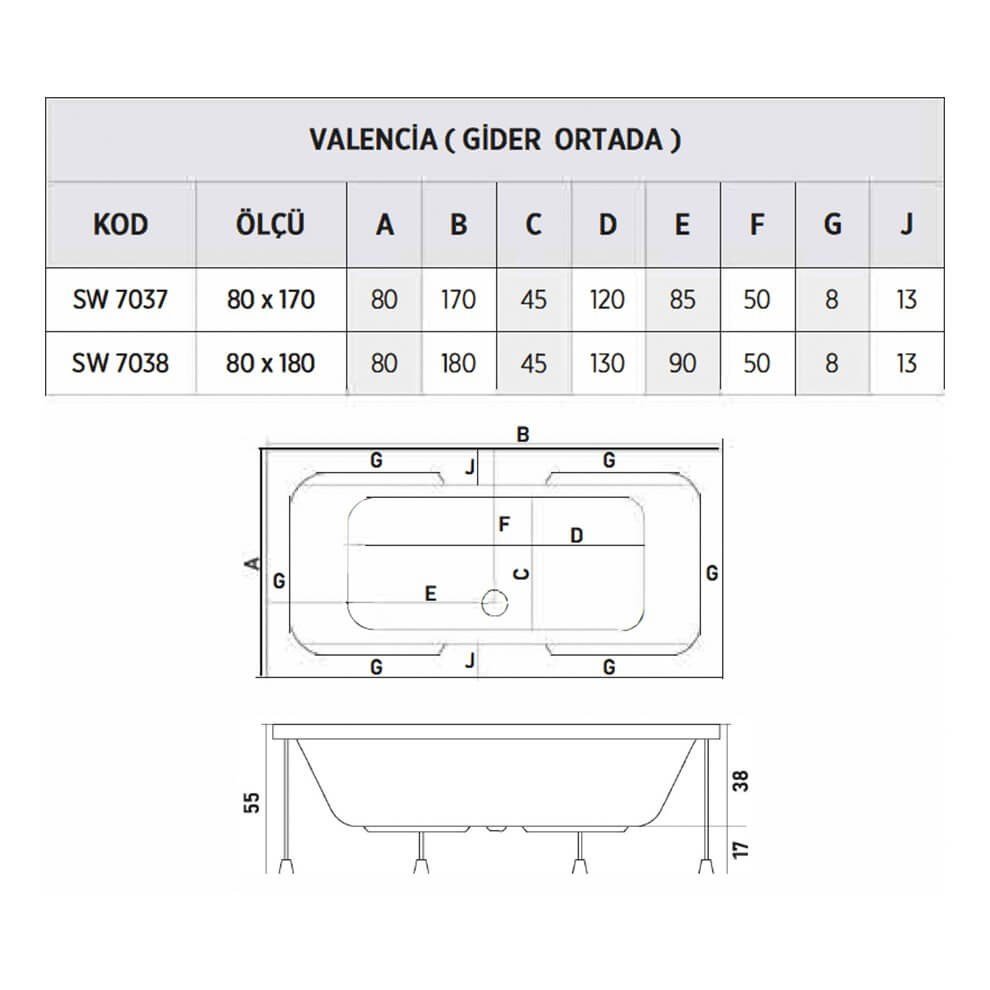 Shower Valencia 180×80 cm Kolluklu Dikdörtgen Küvet