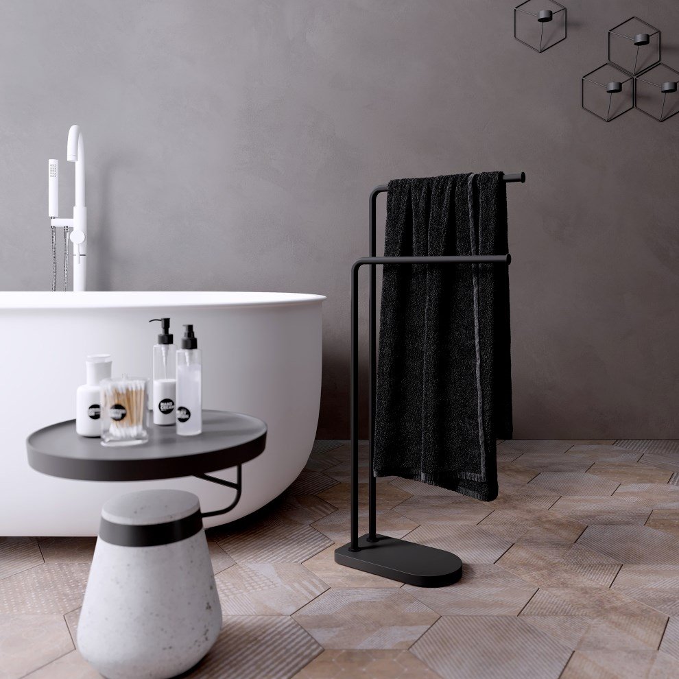 Sonia Nomad Ayaklı Siyah Havluluk. Mat Siyah. İki Havlu Barlı. Yerden Kullanım. Ebat: Yükseklik 83 cm | Genişlik 37 cm | Derinlik 15 cm Detaylı bilgi için Whatsapp üzerinden bize ulaşın.